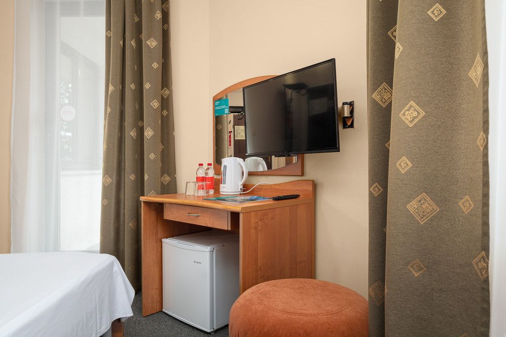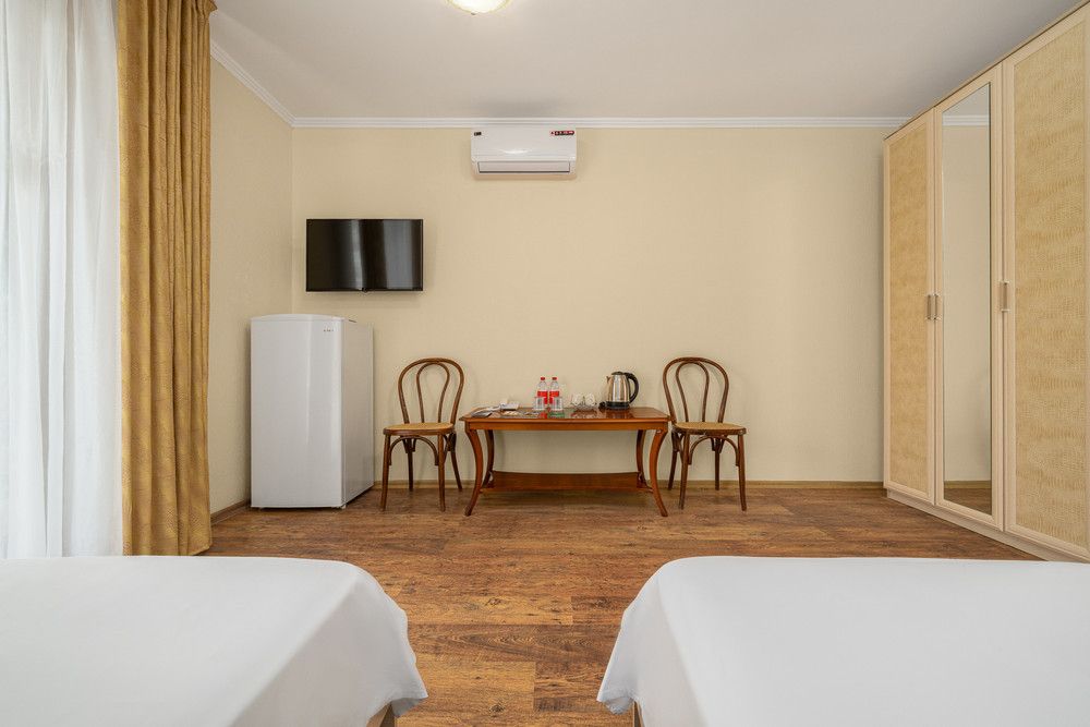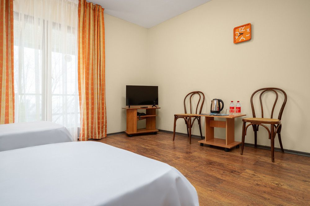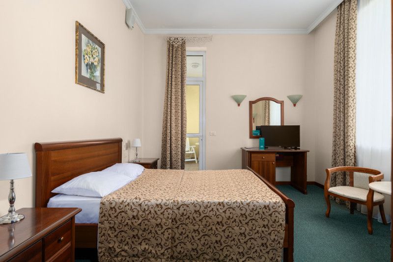 Номер состоящий из спальни и собственной ванной комнаты, оборудован всем необходимым для комфортного размещения и отдыха 1-2 гостей. Номера в корпусе №6 без балкона, есть общая терраса с видом на территорию.