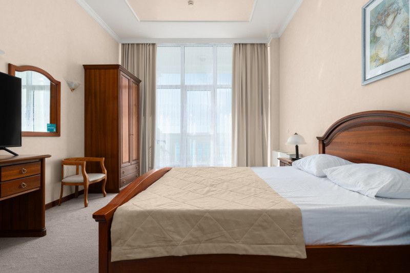 Просторный комфортабельный номер с одной двуспальной кроватью оформлен в приятных светло-бежевых тонах.