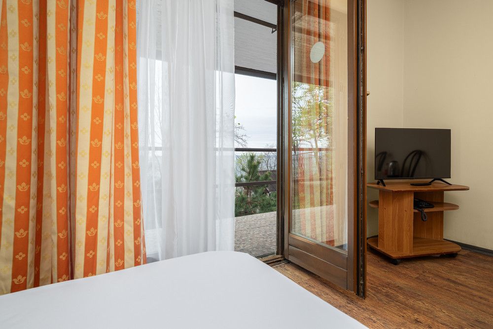 Номер состоящий из спальни и собственной ванной комнаты, оборудован всем необходимым для комфортного размещения и отдыха 1-2 гостей. Номера в корпусе №5 без балкона, есть общая терраса с видом на территорию.
