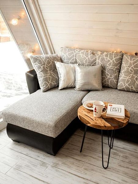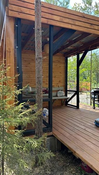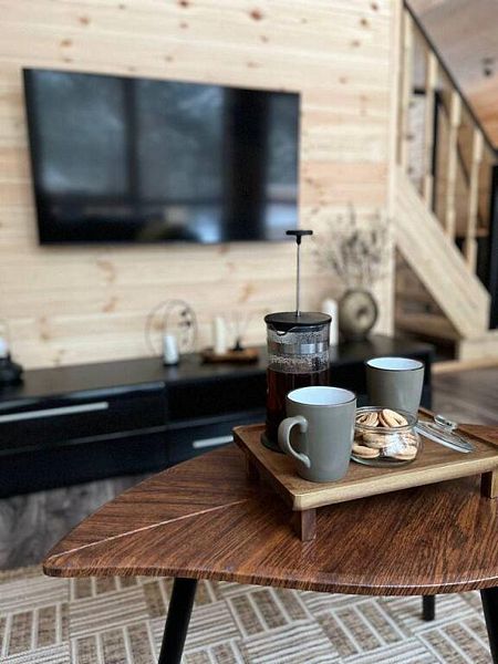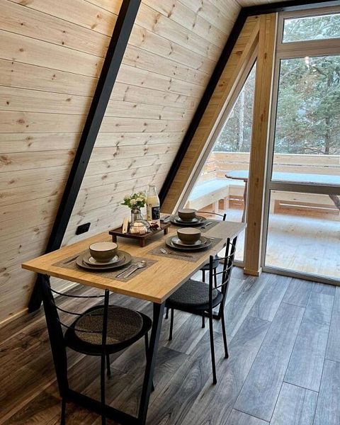 В домике есть абсолютно всё необходимое для комфортного и уютного проживания. А панорамные окна позволяют любоваться видом на лес.