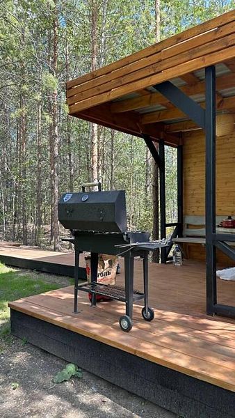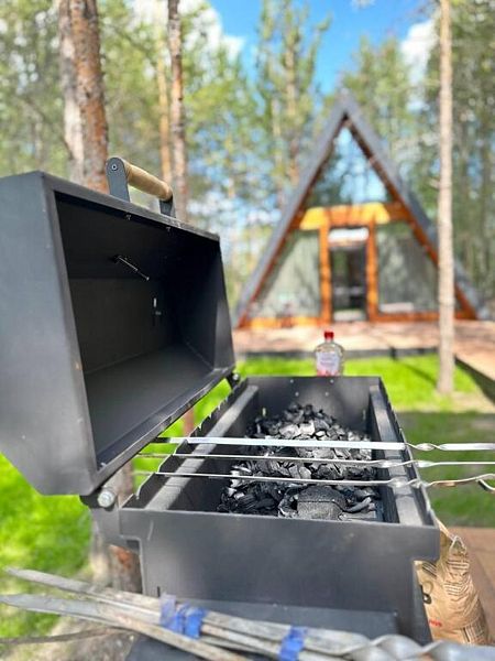 Полностью оборудованная кухня, варочная панель, СВЧ-печь, посуда для приготовления и сервировки. Санузел, душевая. Комплекты полотенец на каждого гостя. Кровать 180х200, телевизор. Терраса на крыше дома, мангальная зона и костровая зона, а также все принадлежности для барбекю. Домик рассчитан на 2х человек.