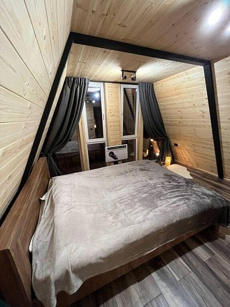 В домике есть абсолютно всё необходимое для комфортного и уютного проживания. А панорамное окно позволяет любоваться видом на лес. В домике теплые полы, а также конвектор.
