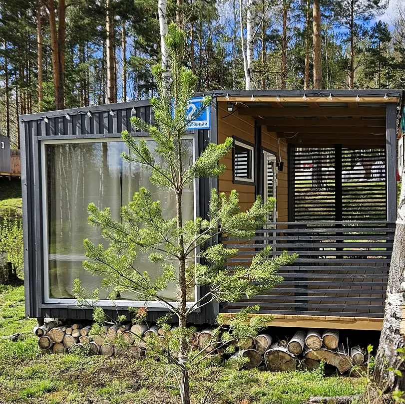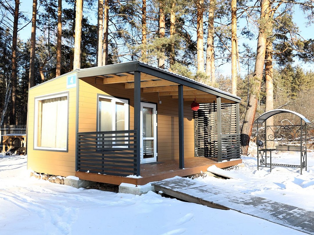 Одномодульный Г-образный средний домик в 21 квадратный метр вмещает четырёх человек: семью или дружную компанию.