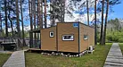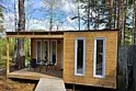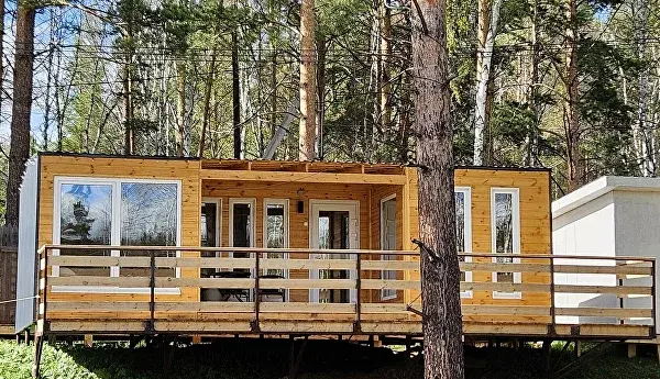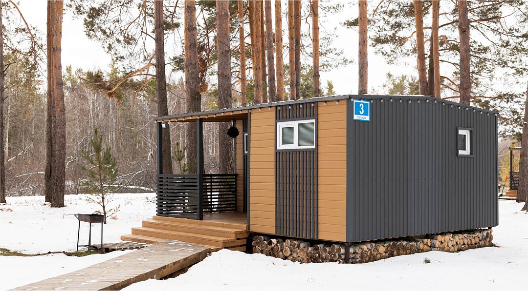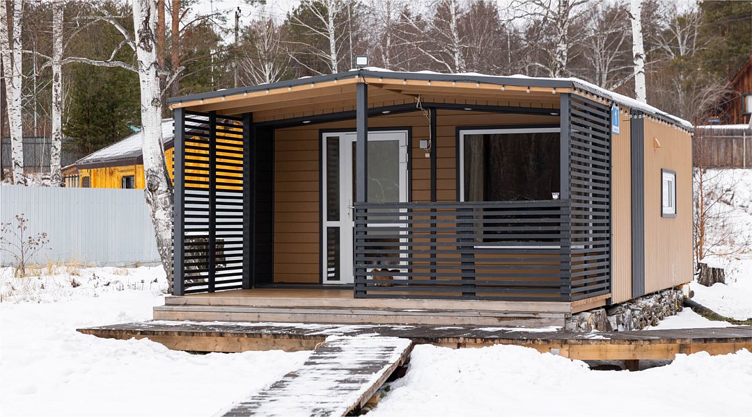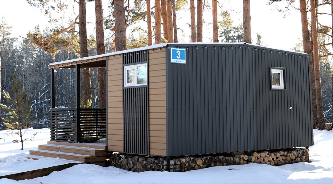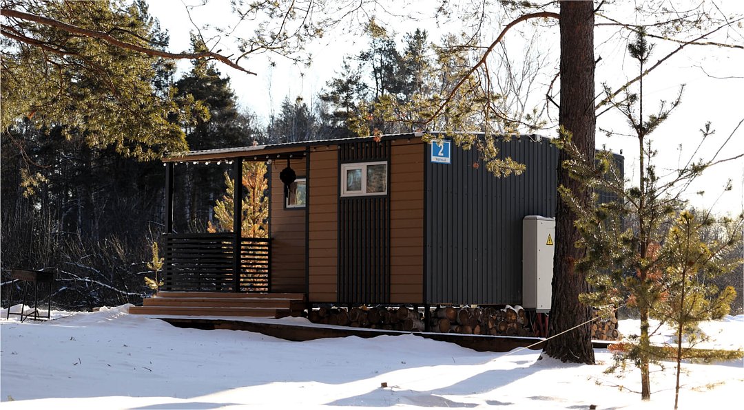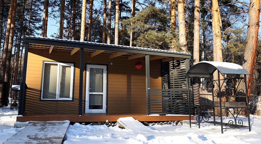 Двухмодульный домик семейный площадью 30 квадратных метров рассчитан на четырёх гостей. Он прекрасно подойдёт для семьи из родителей и двух детей или небольшой компании.