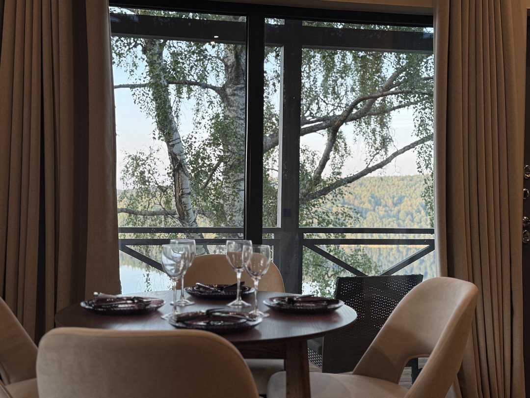Наслаждайтесь блюдами из местных продуктов на открытой террасе или в уютном зале с панорамными окнами, через которые открывается захватывающий вид на лес и озеро.
