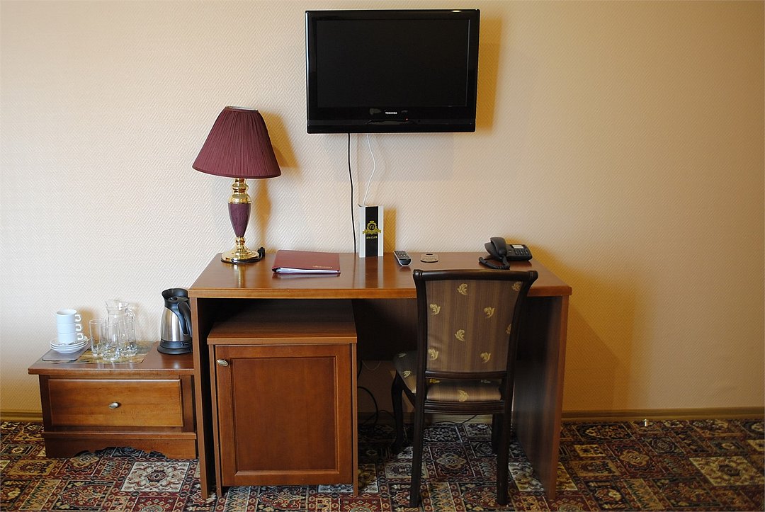 2 кровати (евростандарт), плазменный телевизор, санузел с душевой, рабочий стол, стул, шифоньер, мини-холодильник, электрочайник, чайная посуда, кувшин и стаканы для воды, ковролиновое покрытие пола.Услуги и удобства