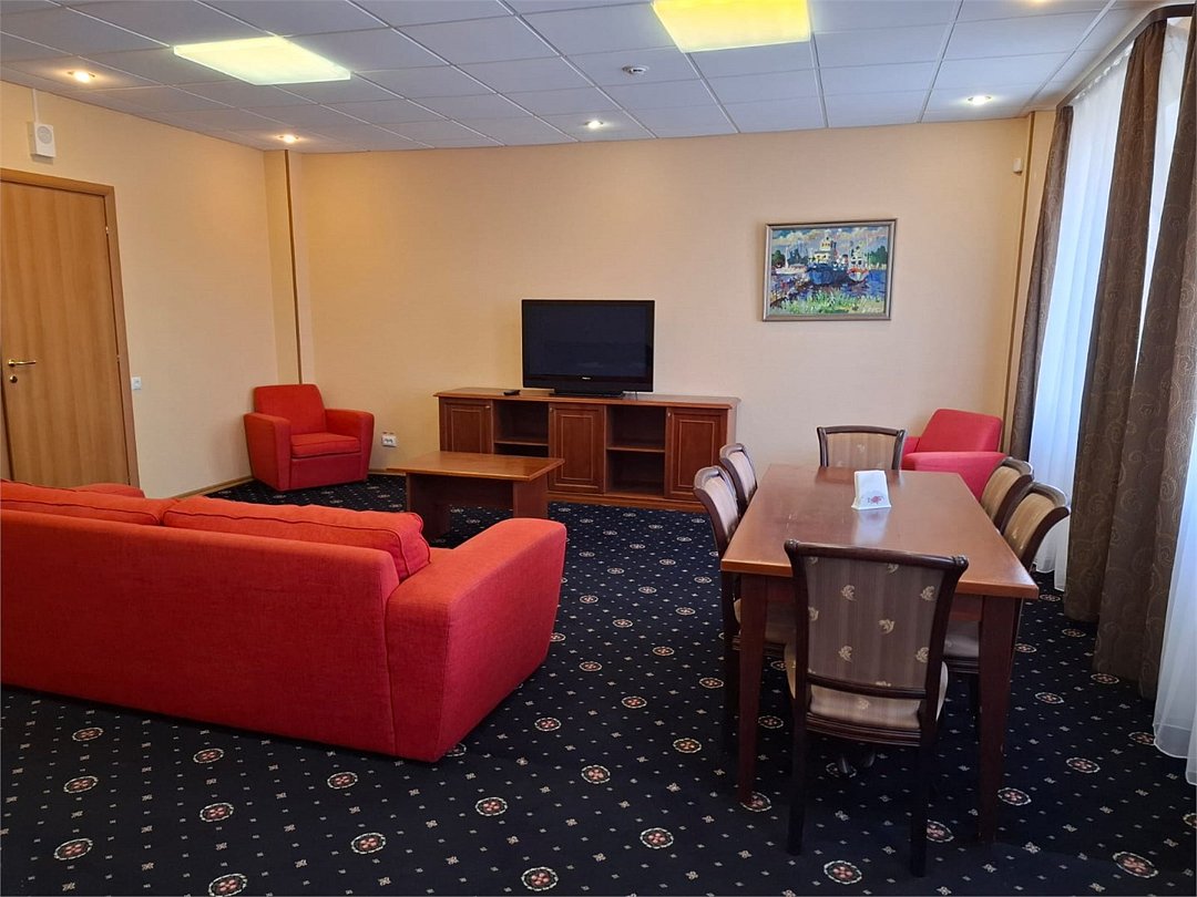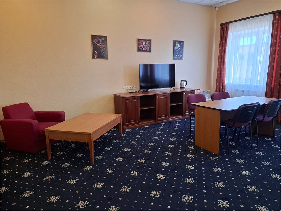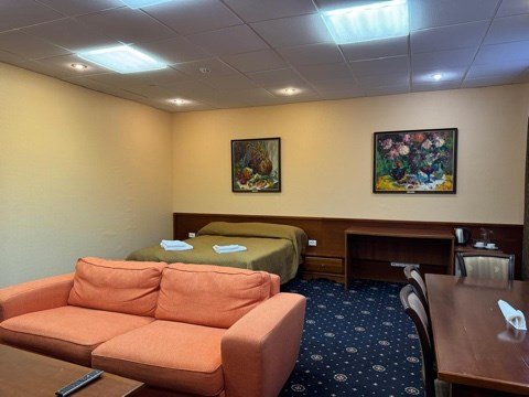 Двуспальные кровать, диван, 2 кресла, прихожая, шифоньер, плазменный телевизор, стол, стулья, санузел, электрочайник, чайная посуда, кувшин и стаканы для воды, мини-холодильник, ковролиновое покрытие пола.Услуги и удобства