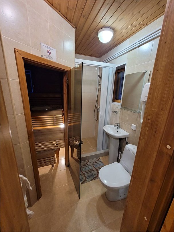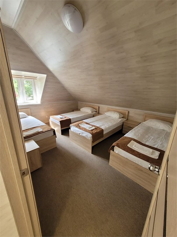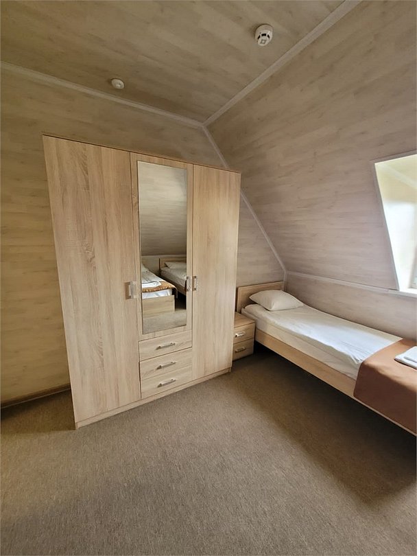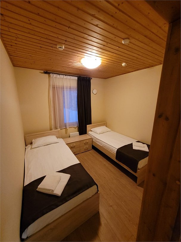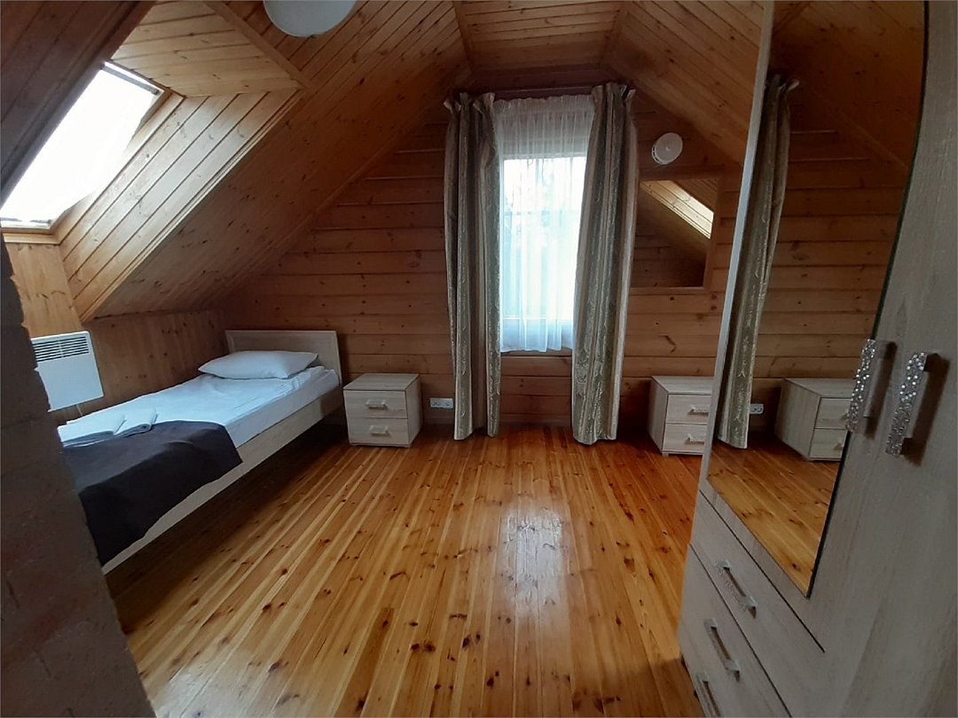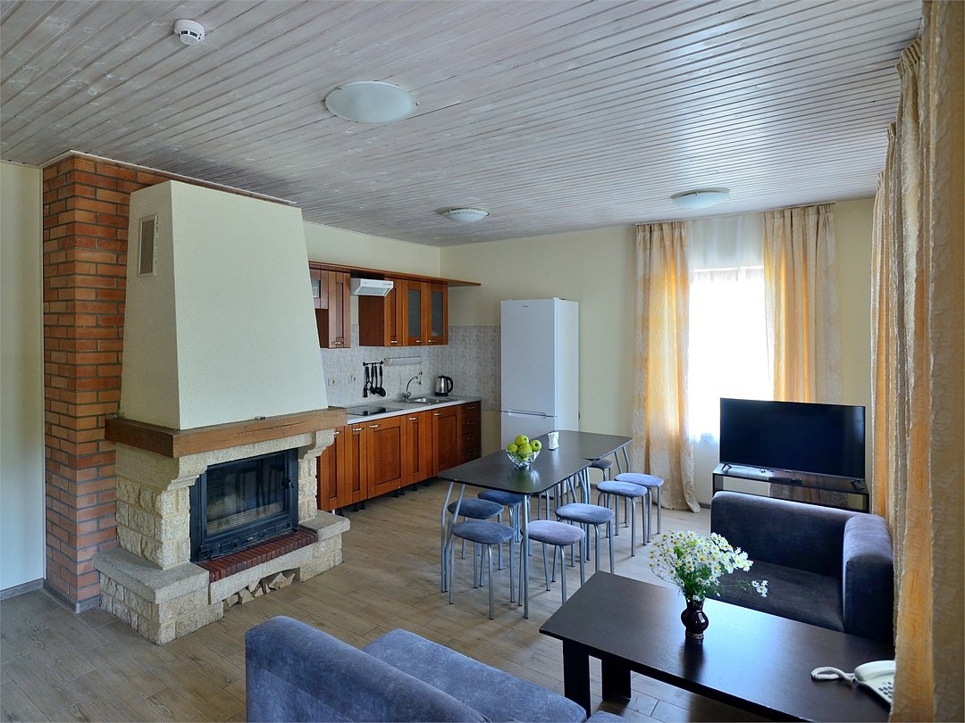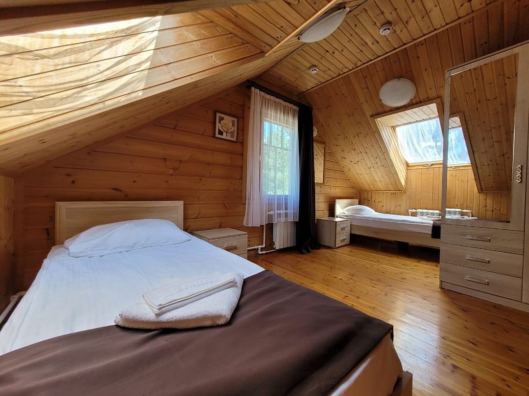 В коттедже: 4 основных места, 2 дополнительных места. Первый этаж: гостиная с камином, спальня с двумя односпальными кроватями, сауна, кухня - столовая, санузел, душ; Второй этаж: холл с мягкой мебелью, одна спальня с двумя односпальными кроватями. Есть 1 коттедж с двуспальной кроватью на 2-м этаже.Услуги и удобства