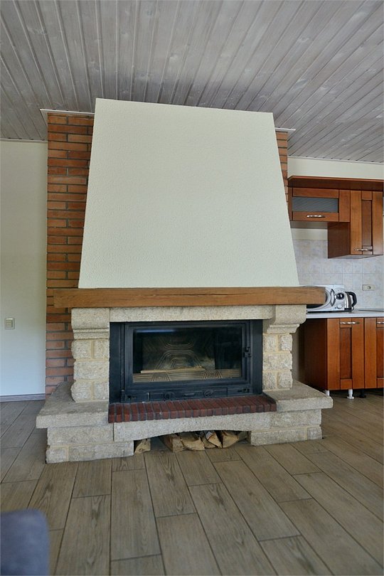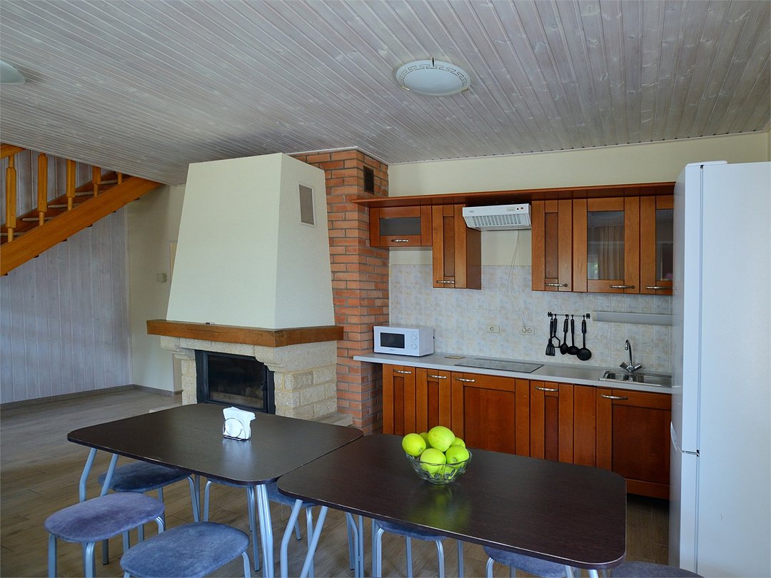 8 основных мест, 2 дополнительных места. Первый этаж: гостиная с камином, спальня с двумя односпальными кроватями, кухня - столовая, санузел, душ; Второй этаж: две спальни с односпальными кроватями (3 кровати и 5 кроватей), санузел.Услуги и удобства