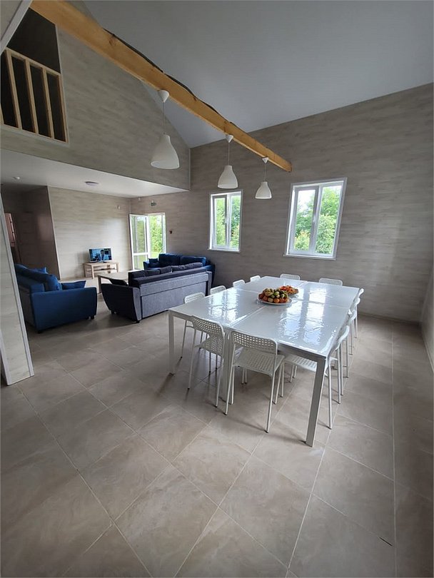 Первый этаж: большая гостиная, кухня - столовая, четыре спальни с односпальными кроватями (1 кровать, 2 кровати, 3 кровати и 3 кровати), два санузла, душ; Второй этаж: пять спален с односпальными кроватями (3 кровати, 2 кровати, 3 кровати, 4 кровати, 3 кровати), два санузла, душ.Услуги и удобства