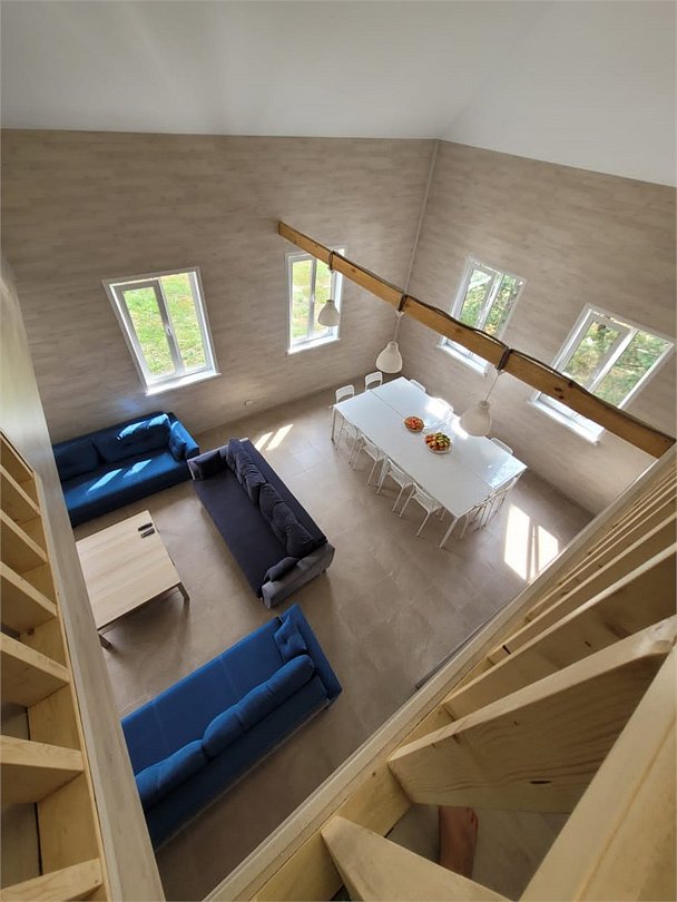 Первый этаж: гостиная, кресла, холл со столами и кухонными принадлежностями, холодильник, микроволновая печь, две спальни с односпальными кроватями (2 кровати и 4 кровати), санузел, душ. Второй этаж: три спальни с односпальными кроватями (2 кровати, 4 кровати и 4 кровати), санузел, душ.Услуги и удобства
