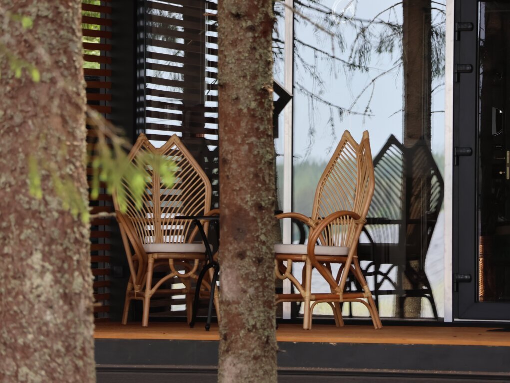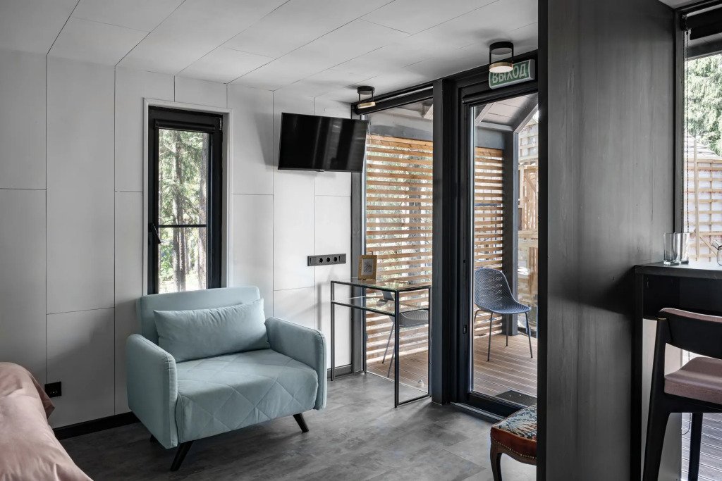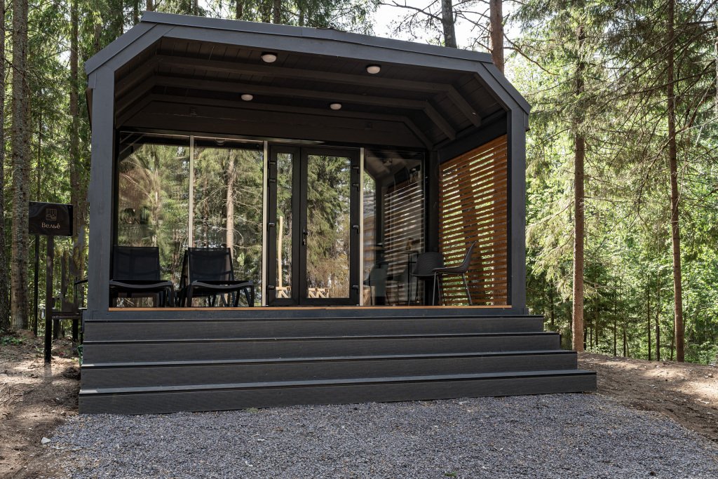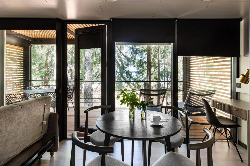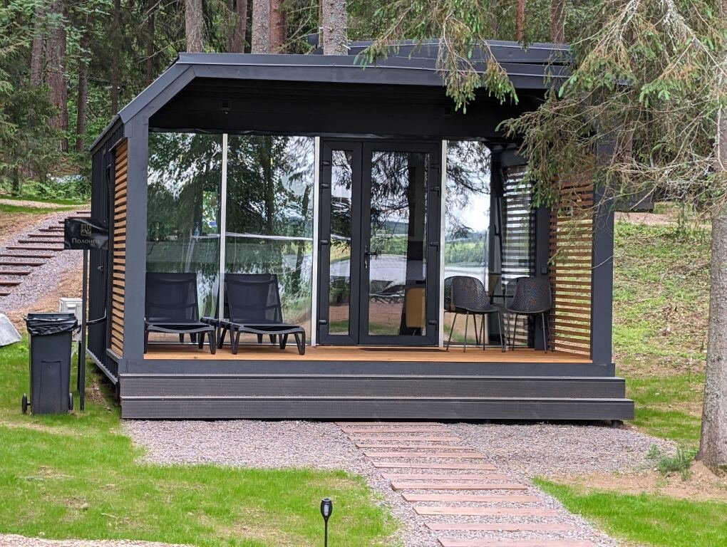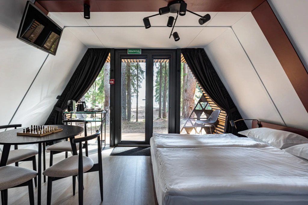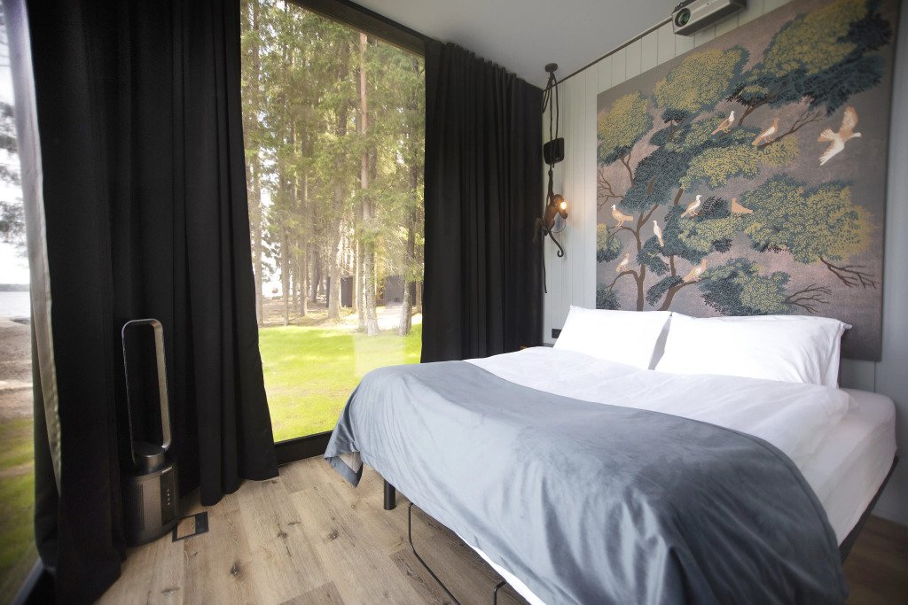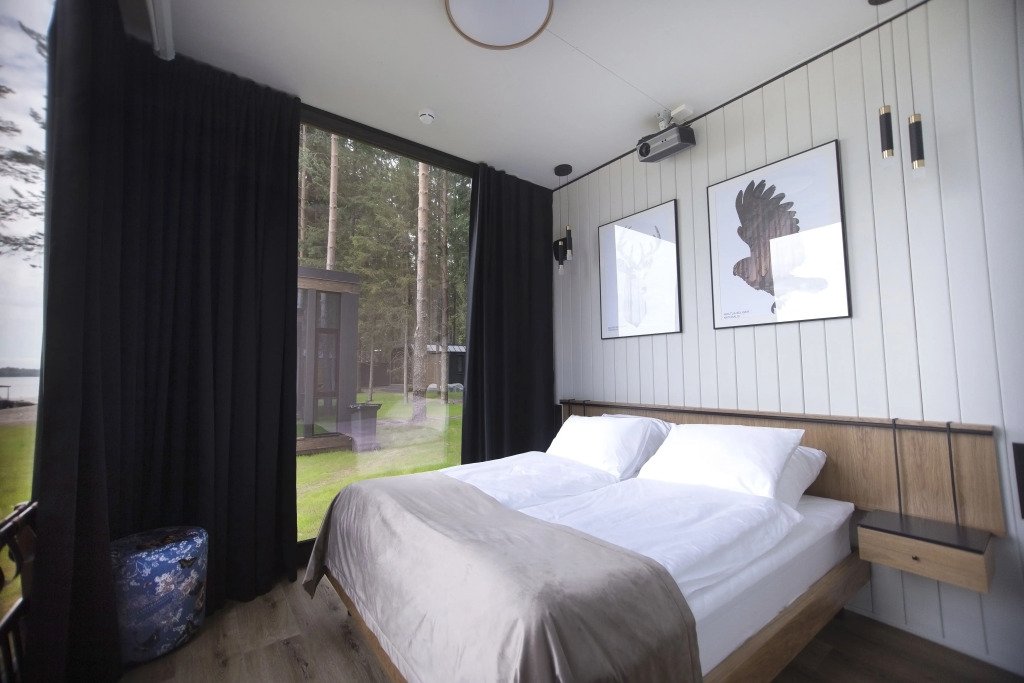 В отеле 11 отдельных домиков в лесу. Дома отличаются по дизайну, при этом выдержан северный стиль. Все дома имеют террасу, панорамные окна с видом на водную гладь озера Селигер.