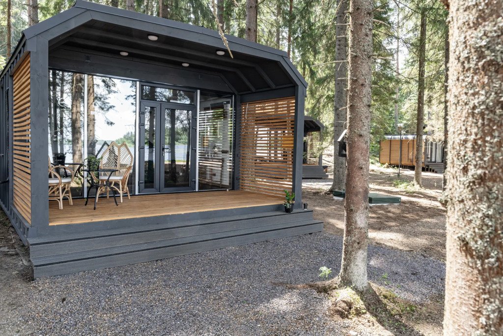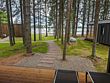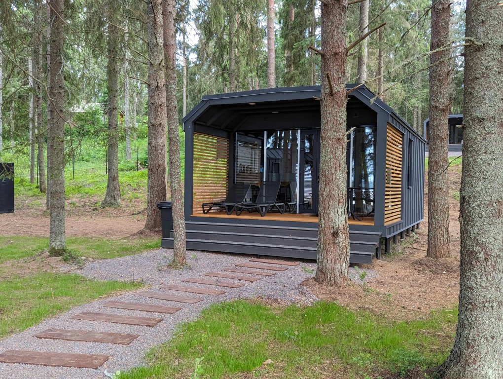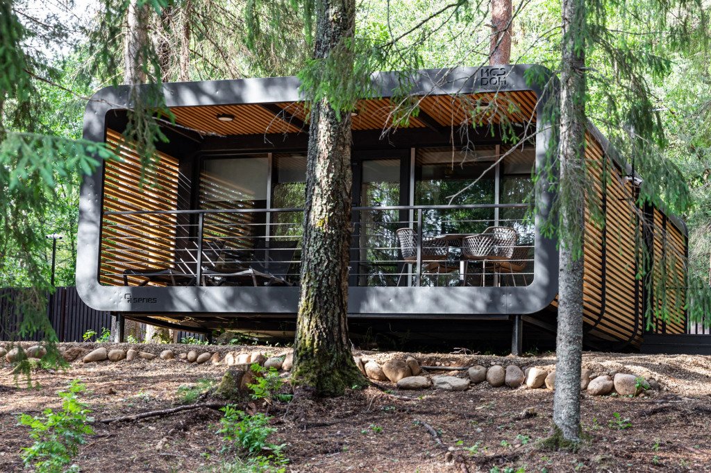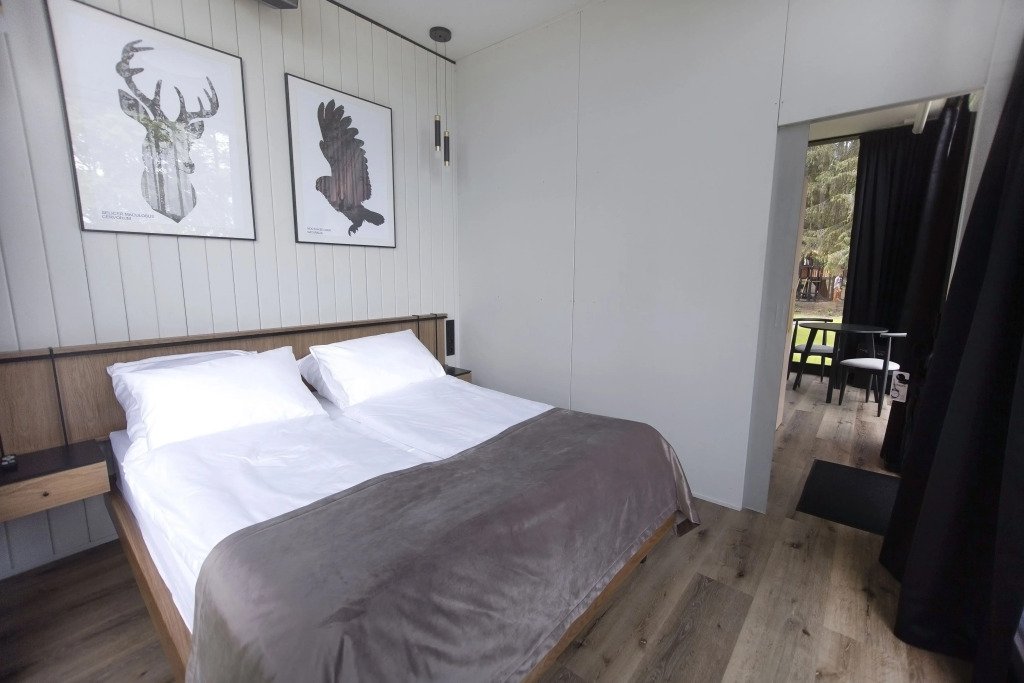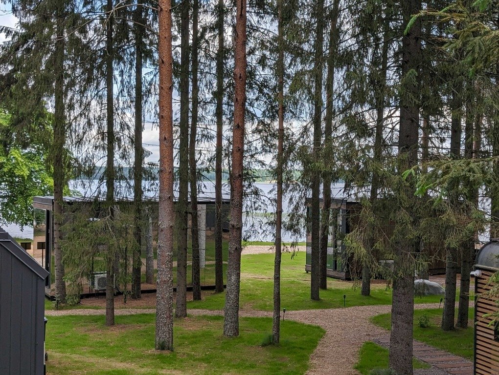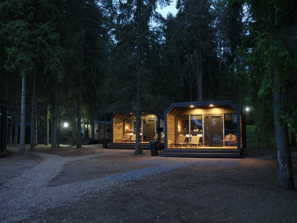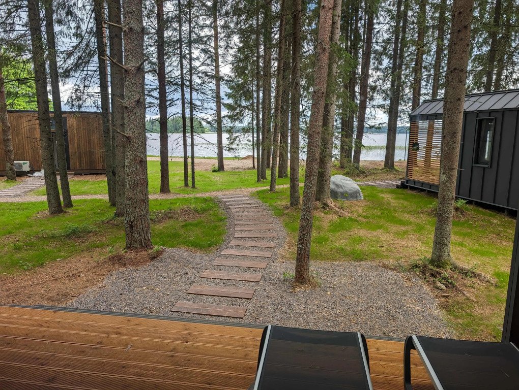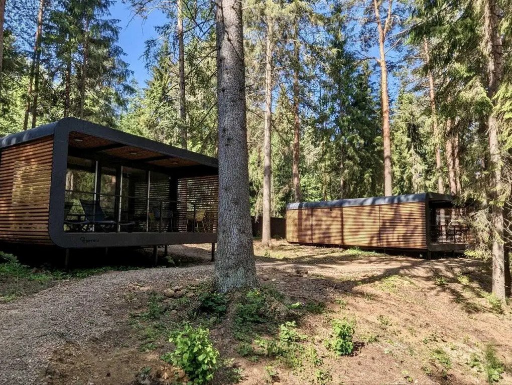 В отеле 11 отдельных домиков в лесу. Дома отличаются по дизайну, при этом выдержан северный стиль. Все дома имеют террасу, панорамные окна с видом на водную гладь озера Селигер.