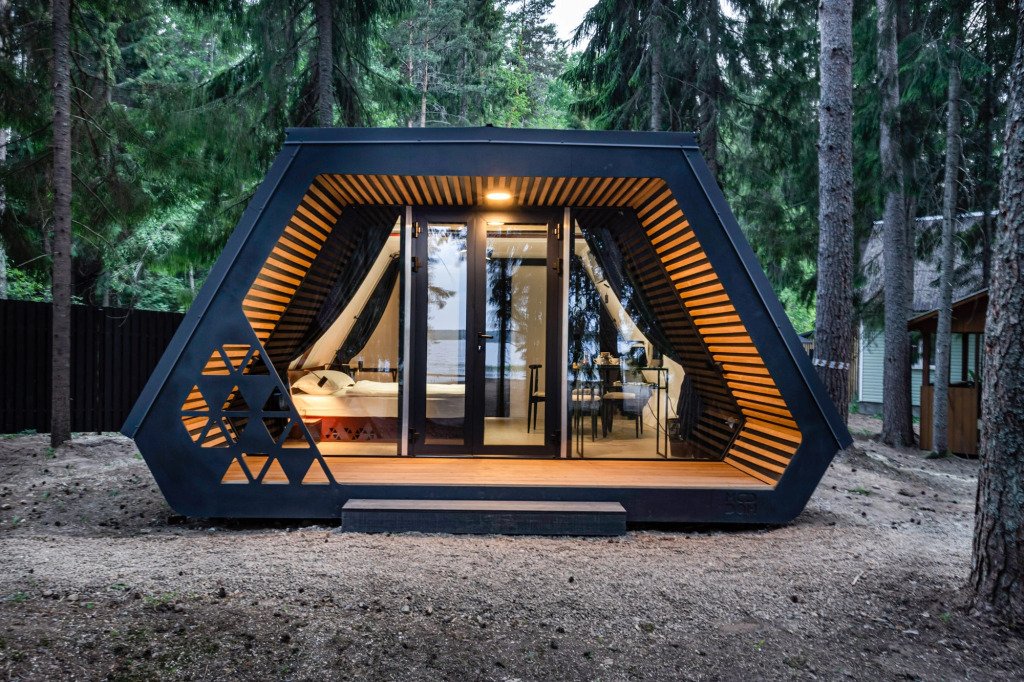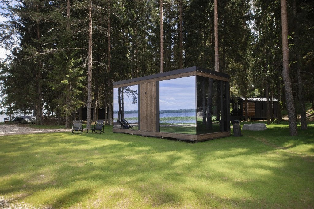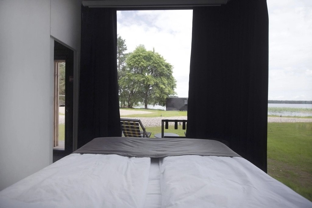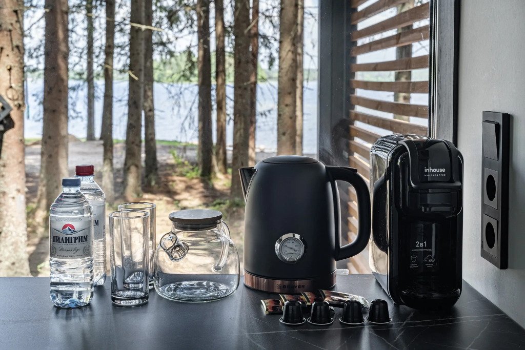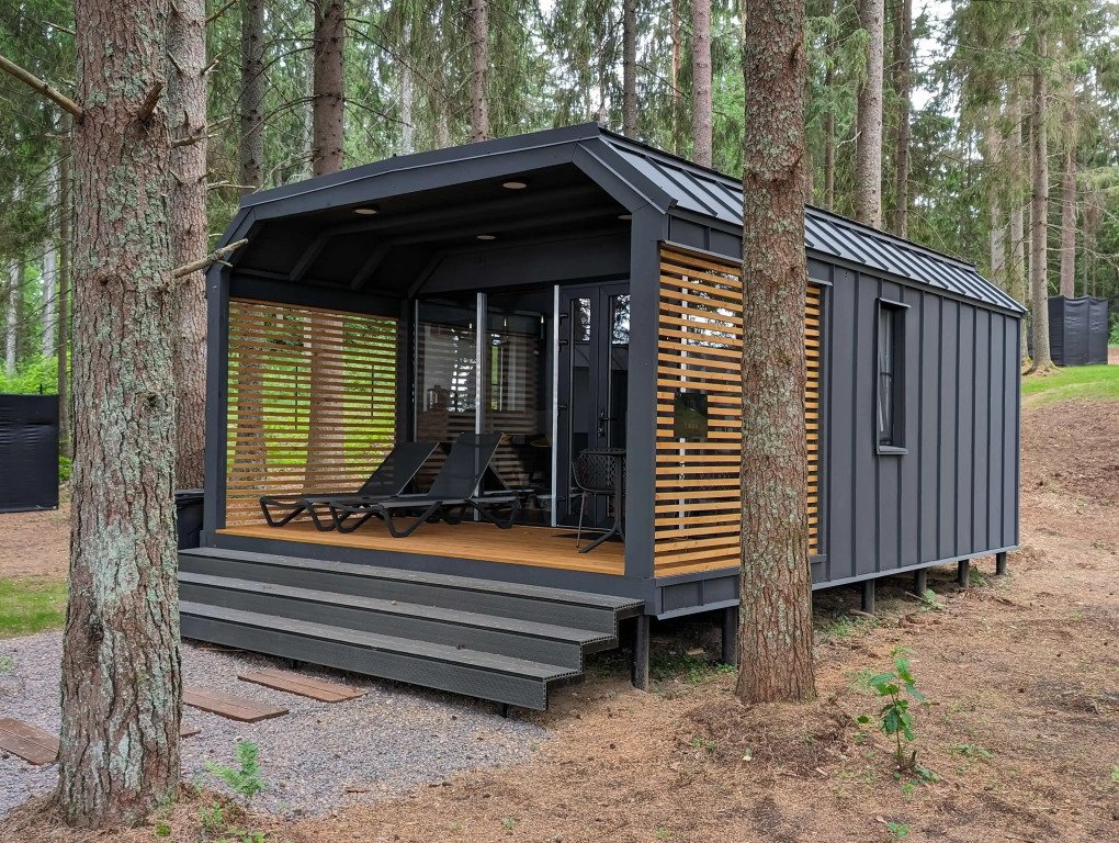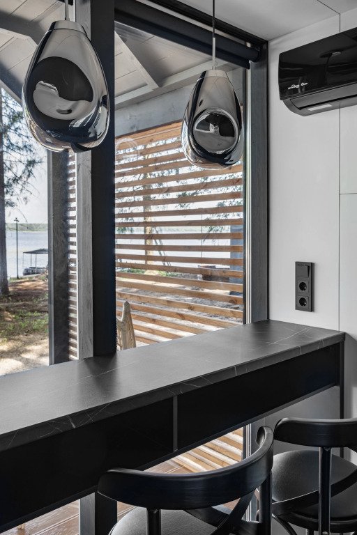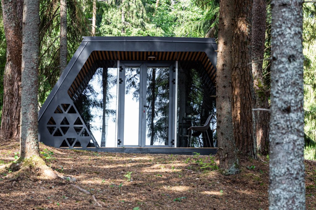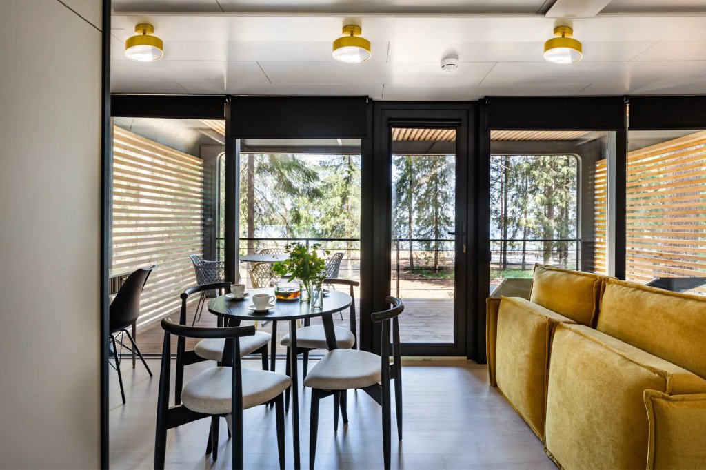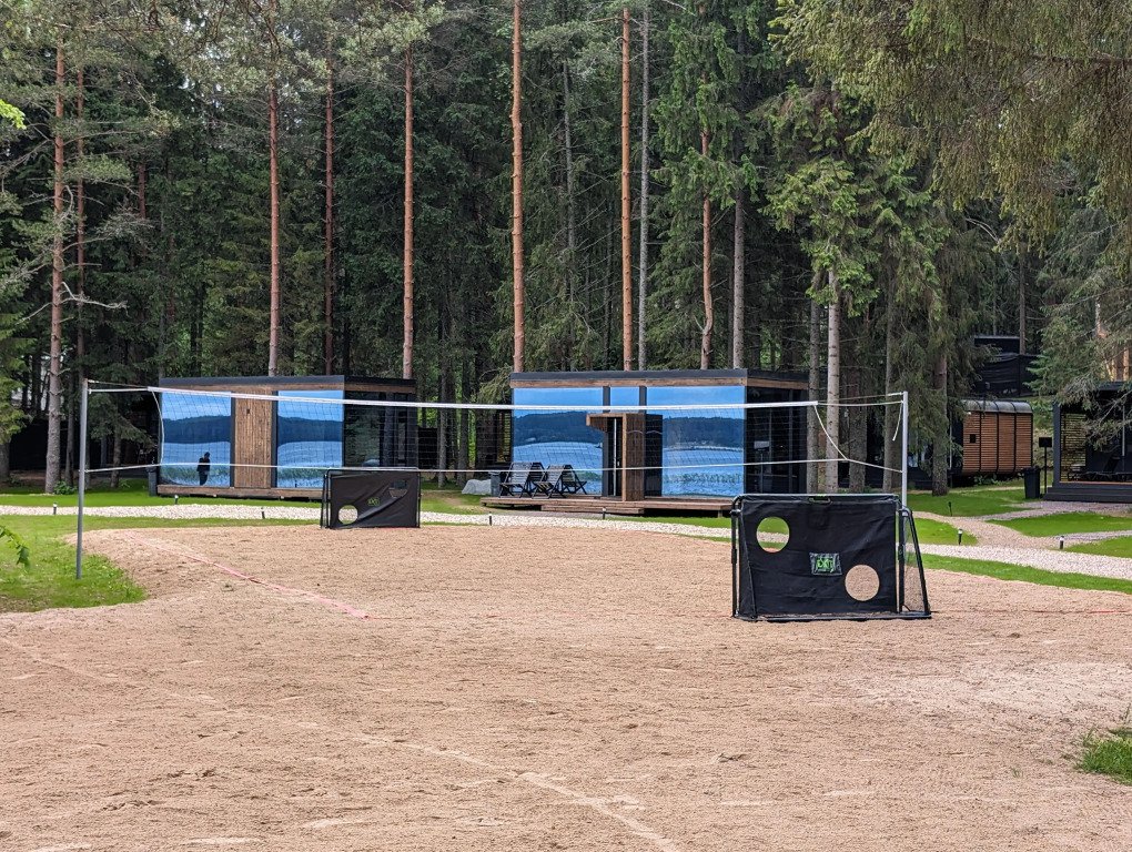 В отеле 11 отдельных домиков в лесу. Дома отличаются по дизайну, при этом выдержан северный стиль. Все дома имеют террасу, панорамные окна с видом на водную гладь озера Селигер.