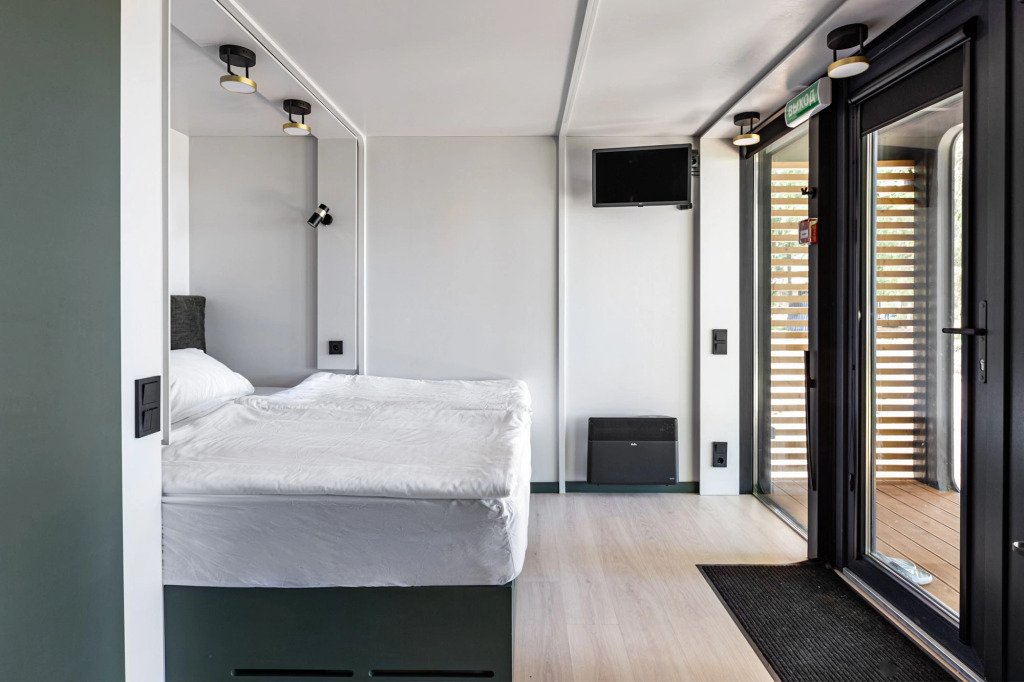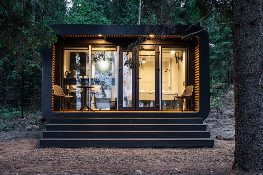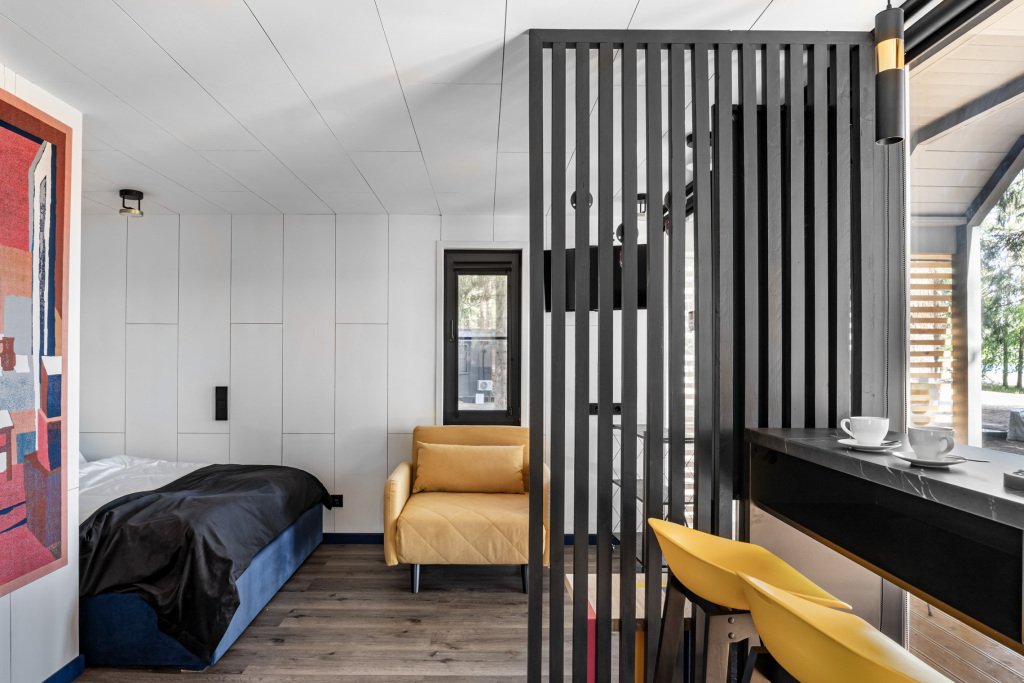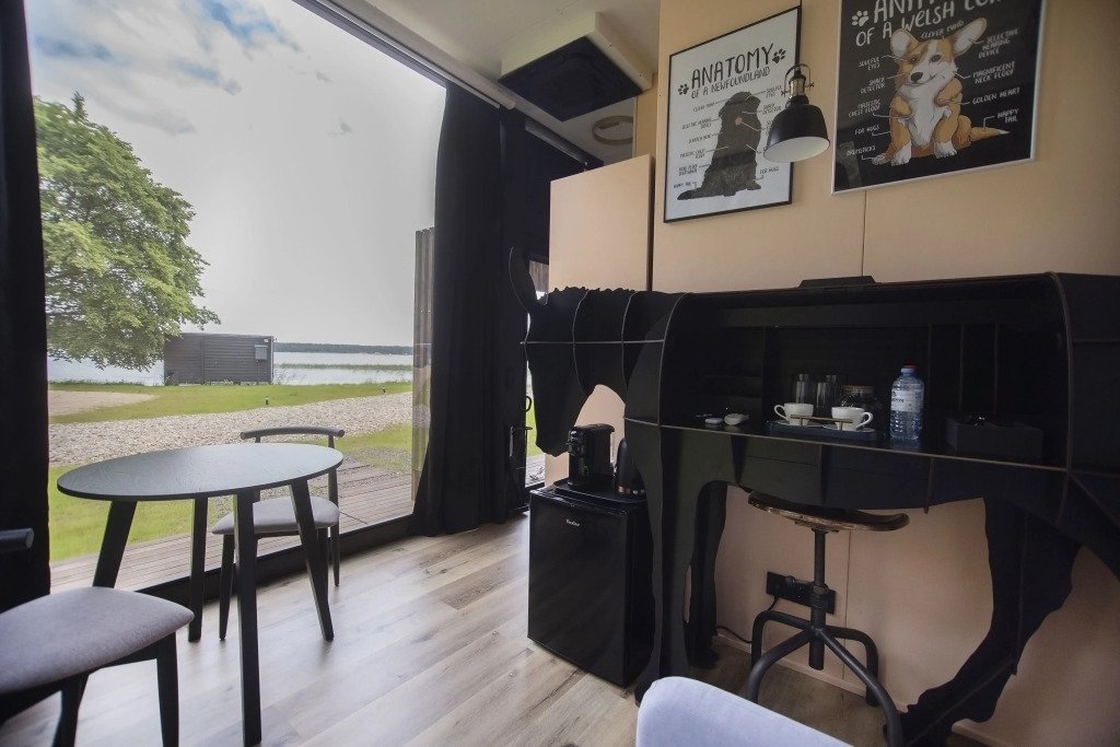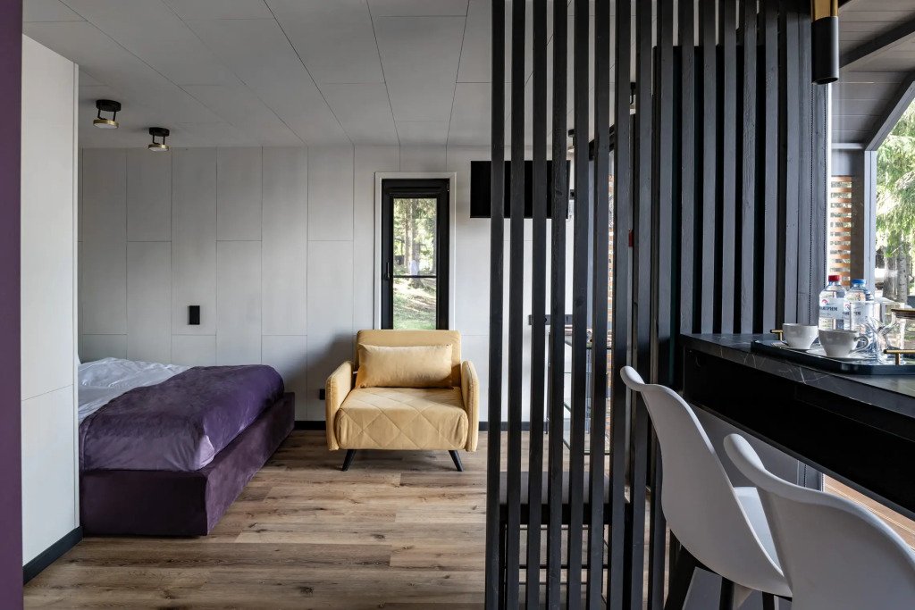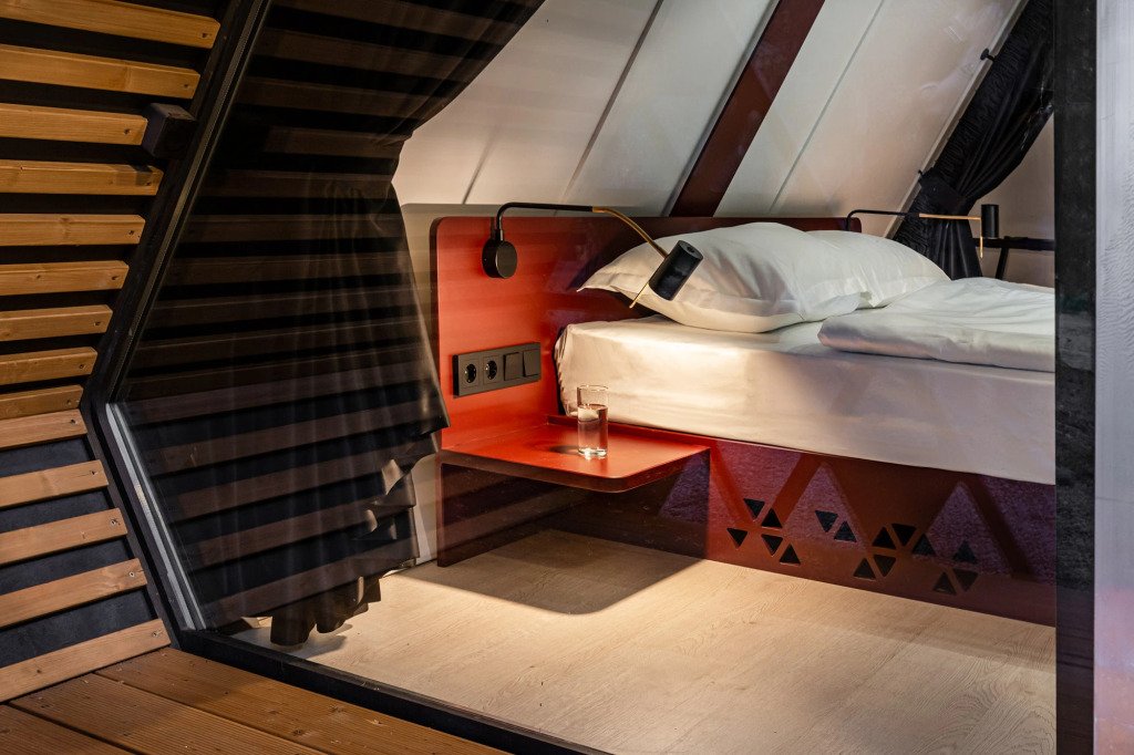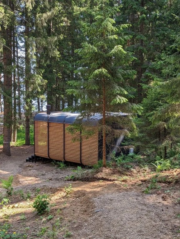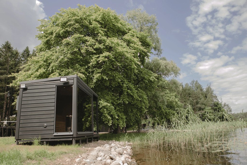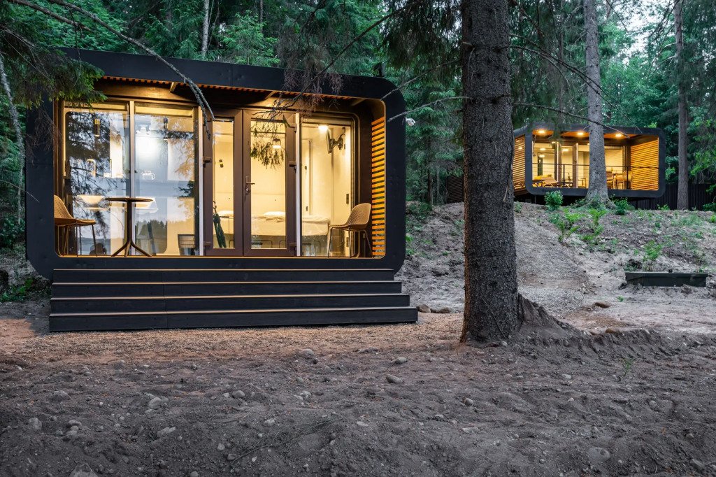 В отеле 11 отдельных домиков в лесу. Дома отличаются по дизайну, при этом выдержан северный стиль. Все дома имеют террасу, панорамные окна с видом на водную гладь озера Селигер.