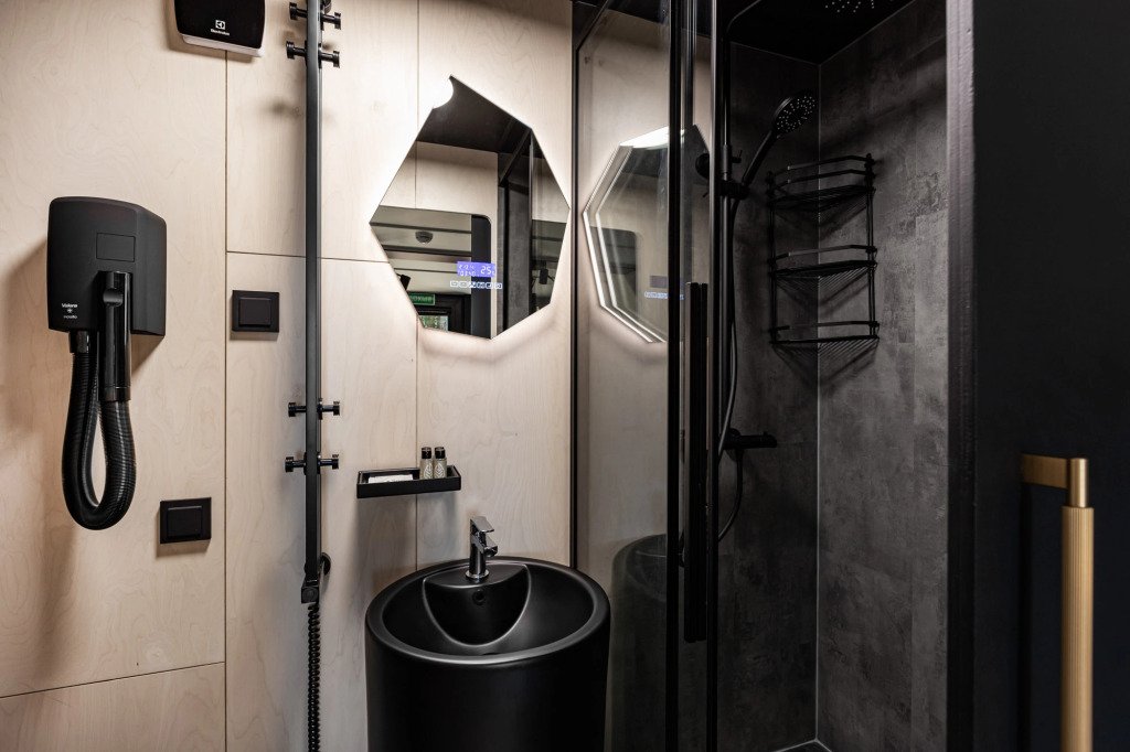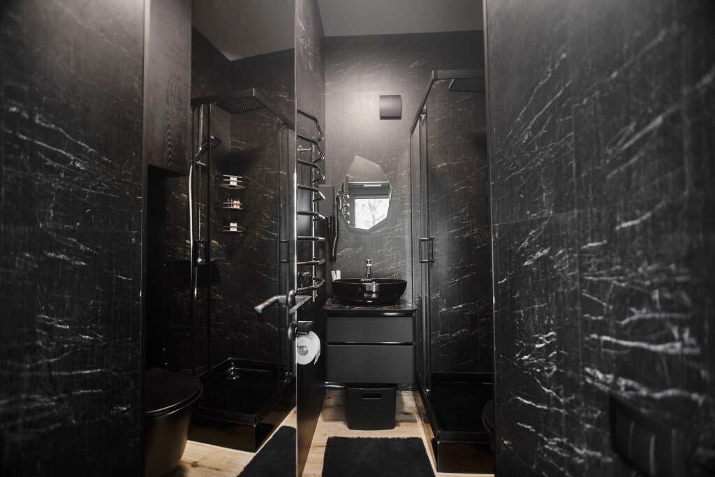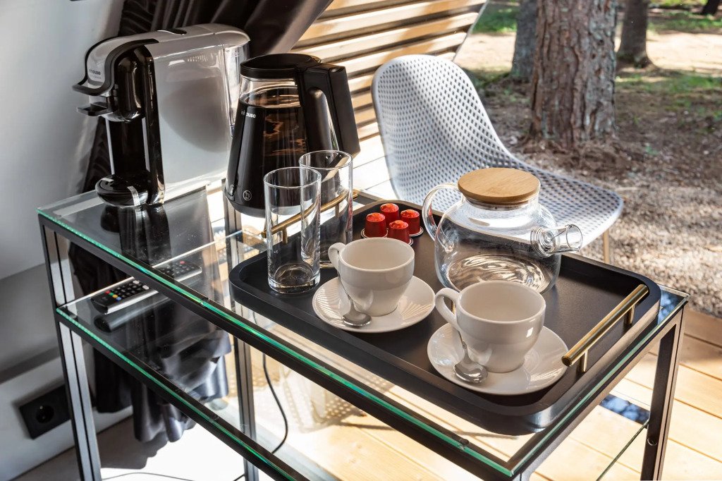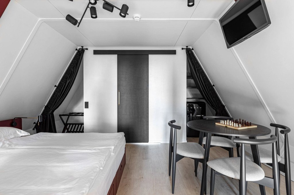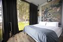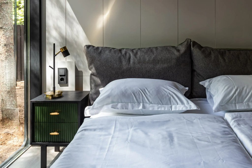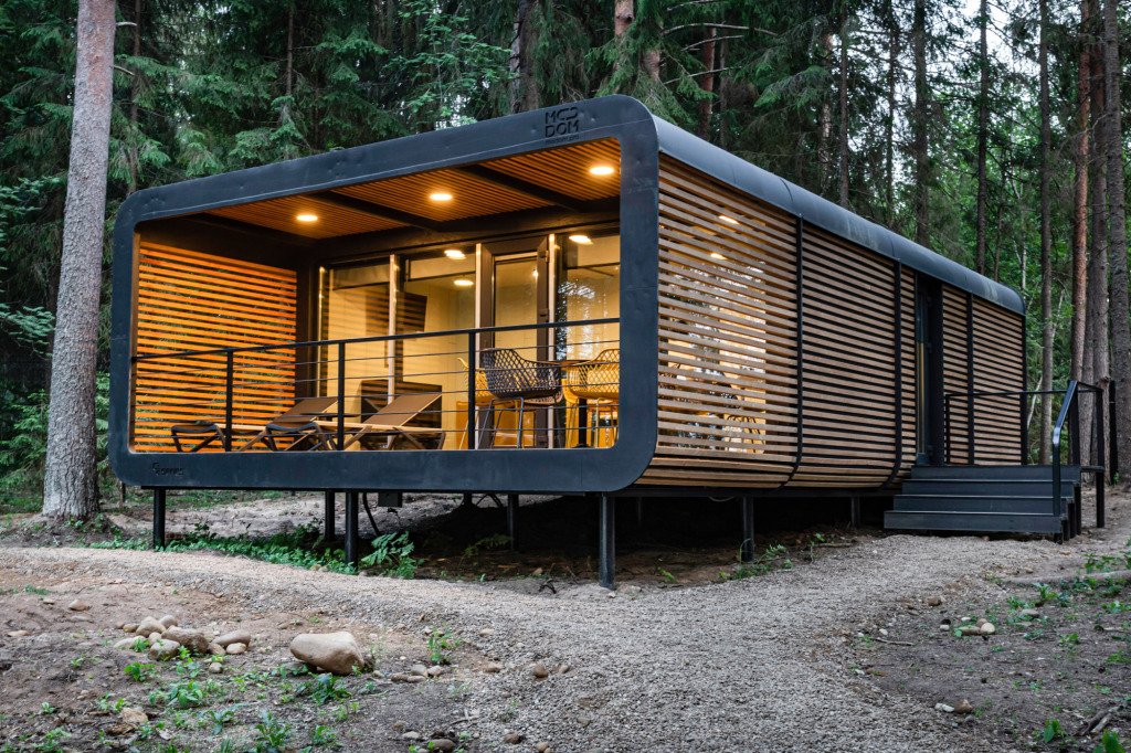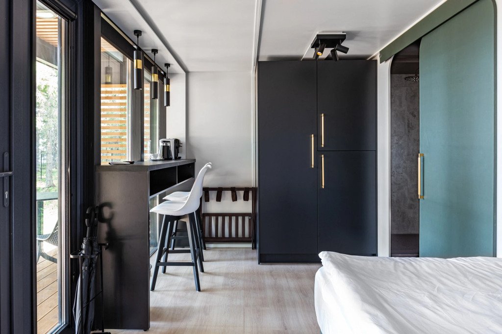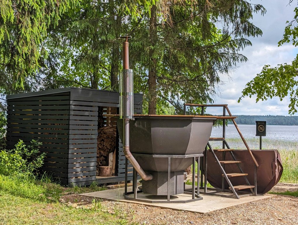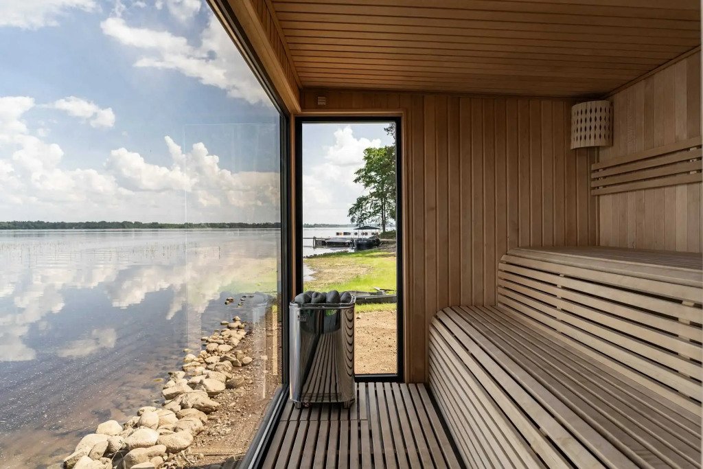 В отеле 11 отдельных домиков в лесу. Дома отличаются по дизайну, при этом выдержан северный стиль. Все дома имеют террасу, панорамные окна с видом на водную гладь озера Селигер.