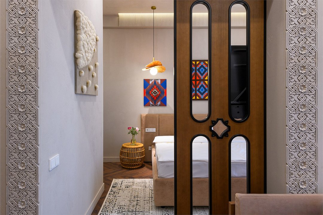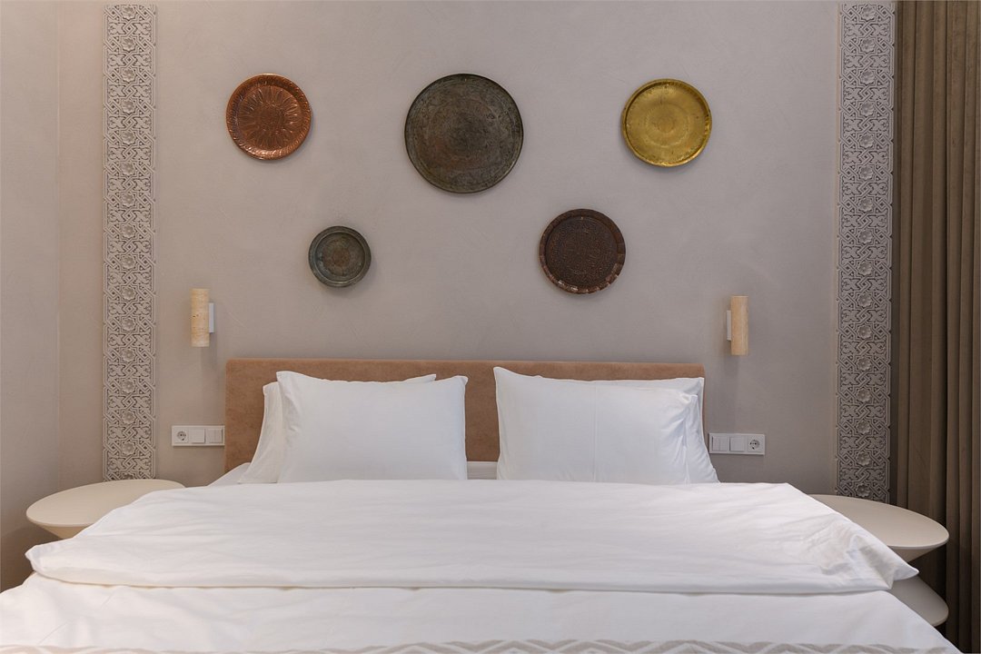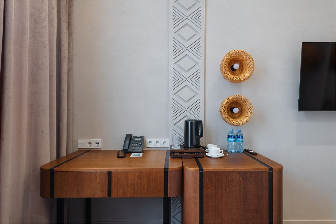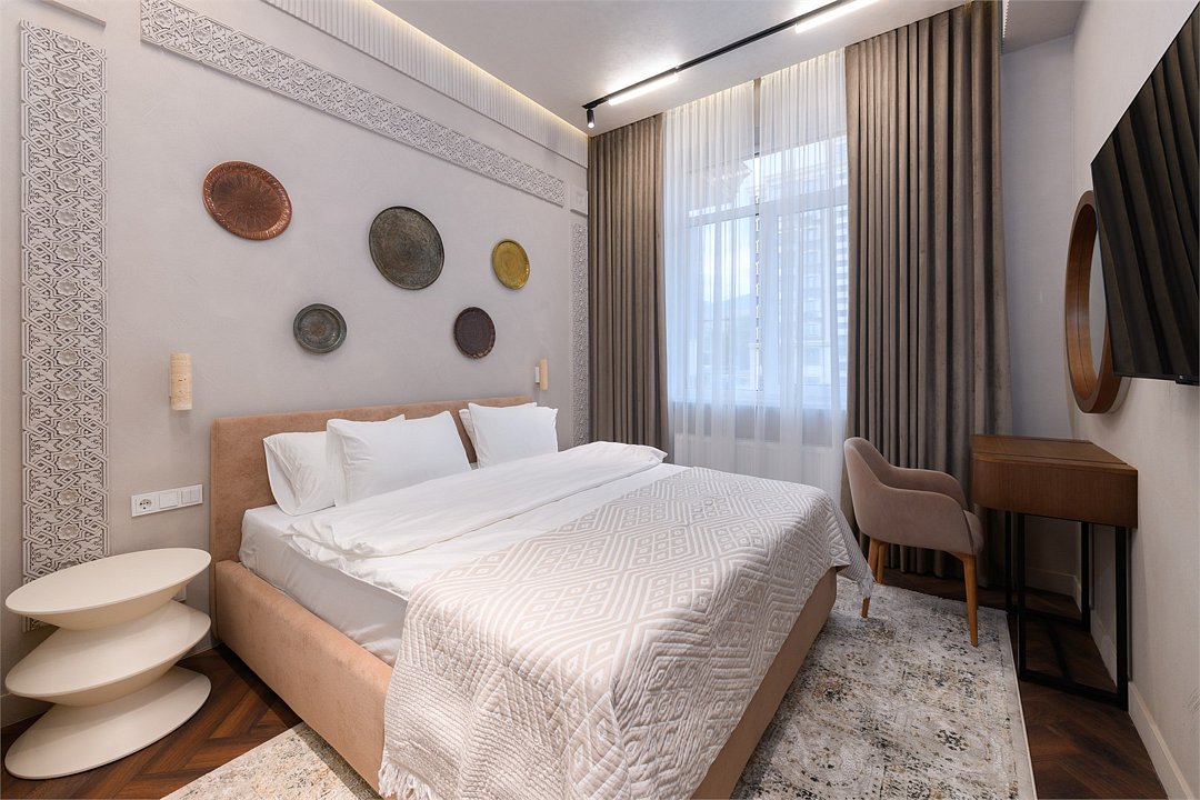 Компактный однокомнатный номер площадью 22 м2 с дизайнерским ремонтом в природных светлых оттенках. Каждый номер имеет уникальный интерьер с аутентичным декором, передающим восточный колорит. Из окна открывается вид на двор жилого комплекса или городской ландшафт. Номер оснащен двуспальной кроватью king-size 180х200 см с ортопедическим матрасом для комфортного сна. Также в комнате есть телевизор с функцией Smart-TV, мини-бар и сейф. Для чайных церемоний прямо в номере предусмотрена посуда и чайная станция. Санузел номера с душевой кабиной укомплектован тапочками и халатами, мягкими махровыми полотенцами, приветственным набором косметических и гигиенических принадлежностей.Услуги и удобства