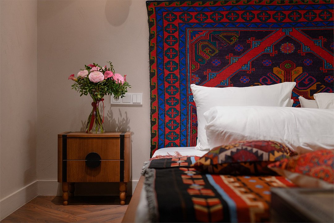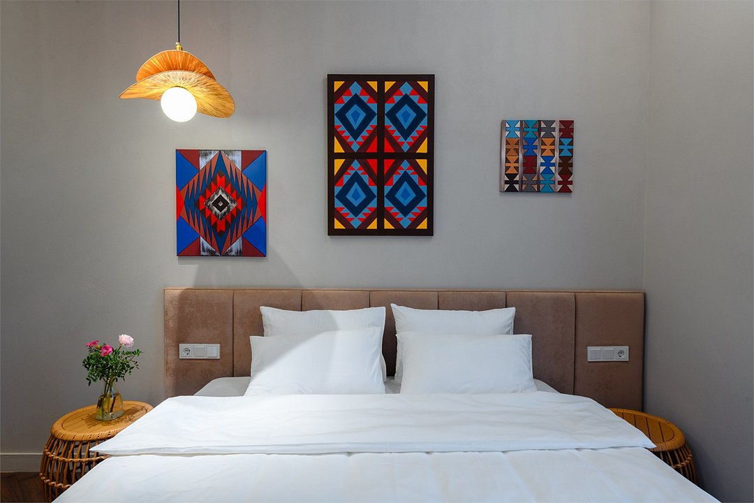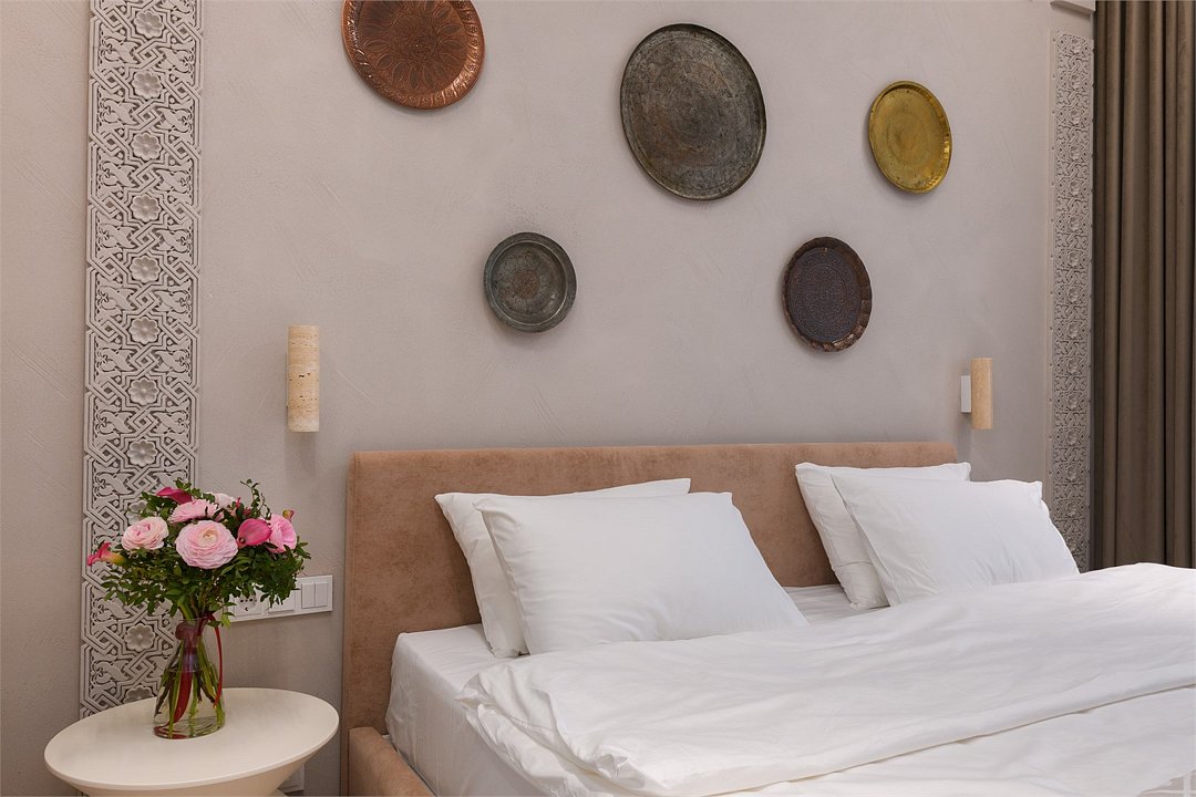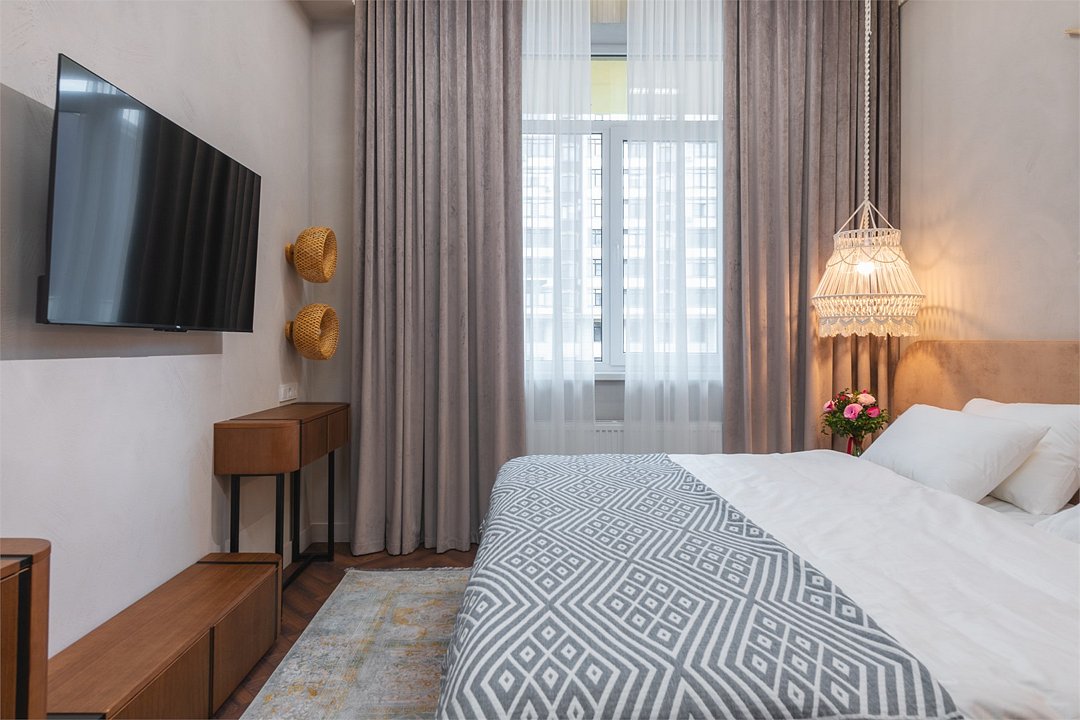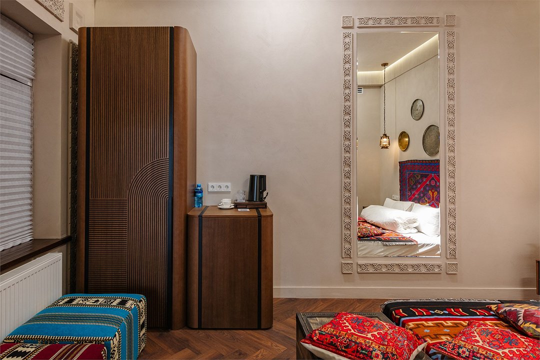 Компактный однокомнатный номер площадью 22 м2 с дизайнерским ремонтом в природных светлых оттенках. Каждый номер имеет уникальный интерьер с аутентичным декором, передающим восточный колорит. Из окна открывается вид на двор жилого комплекса или городской ландшафт. Номер оснащен двуспальной кроватью king-size 180х200 см с ортопедическим матрасом для комфортного сна. Также в комнате есть телевизор с функцией Smart-TV, мини-бар и сейф. Для чайных церемоний прямо в номере предусмотрена посуда и чайная станция. Санузел номера с душевой кабиной укомплектован тапочками и халатами, мягкими махровыми полотенцами, приветственным набором косметических и гигиенических принадлежностей.Услуги и удобства
