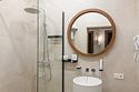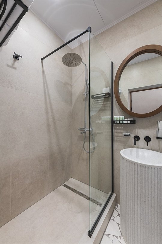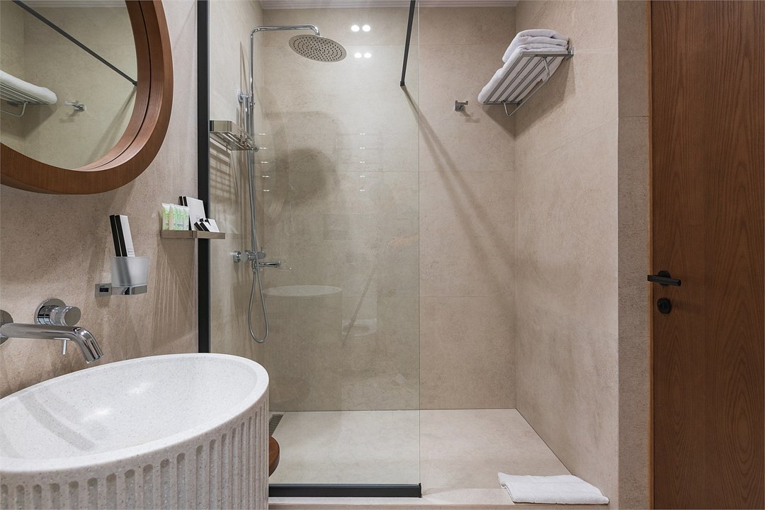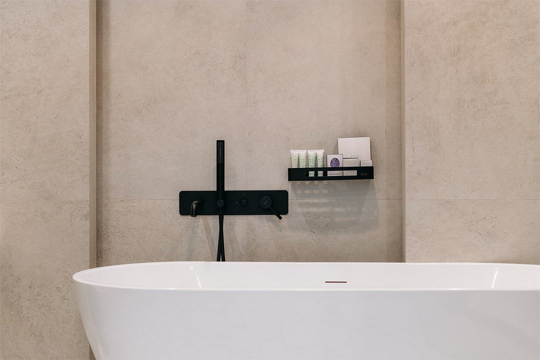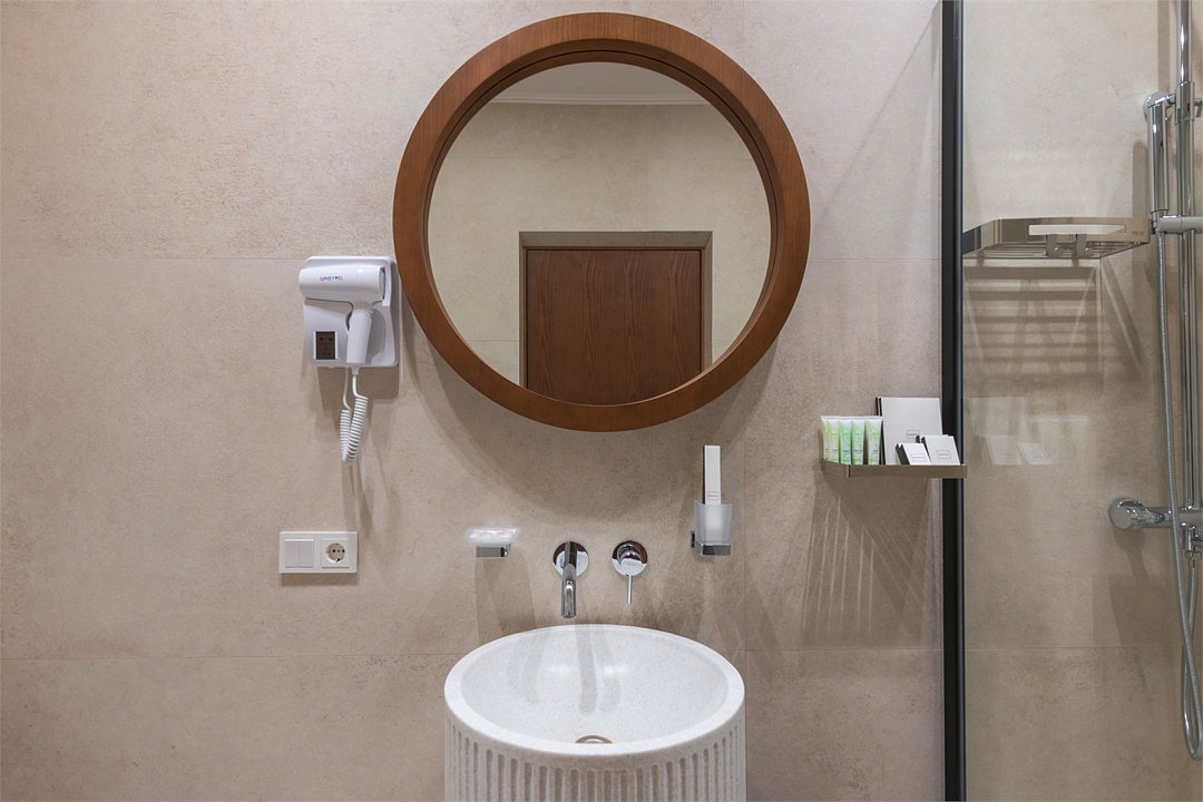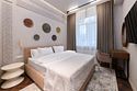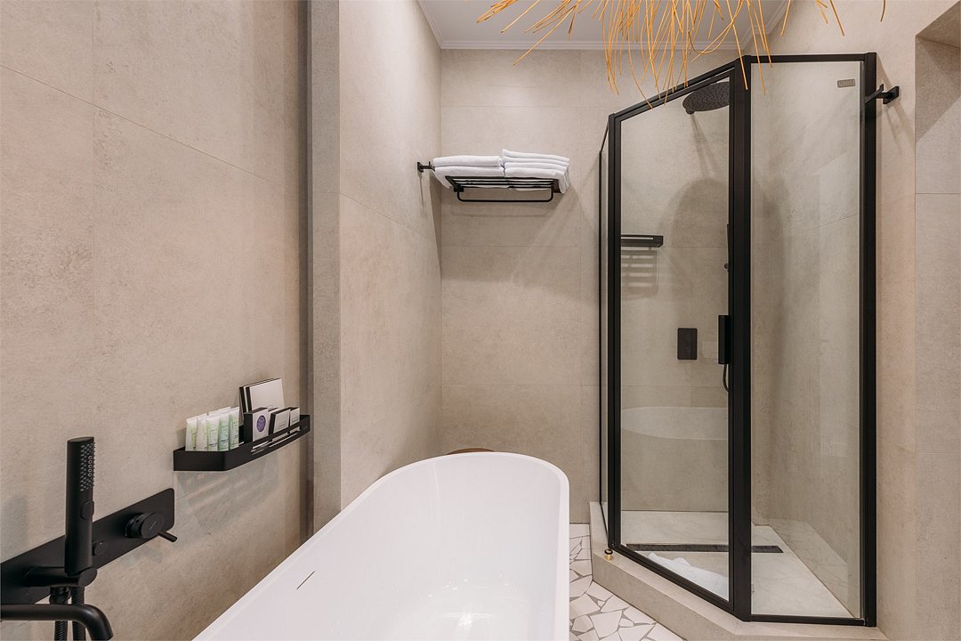 Роскошный номер площадью 42 м2, где сочетается эксклюзивный дизайн и непревзойденный комфорт. Просторный номер разделен на две отдельные комнаты: спальня и гостиная. В комнате для сна гостя ждет удобная кровать king-size 180х200 см с ортопедическим матрасом и шторы блэкаут, которые полностью блокируют дневной свет из окна. Для комфорта гостей в номере: телевизор с функцией Smart-TV, мини-бар, сейф, зона отдыха с удобными диванами, чайная станция и посуда для чаепития. В просторном санузле размещены душевая кабина и ванна необычной формы из натурального камня для ваших любимых СПА-процедур прямо в номере. Санузел номера с душевой кабиной укомплектован тапочками и халатами, мягкими махровыми полотенцами, приветственным набором косметических и гигиенических принадлежностей.Услуги и удобства