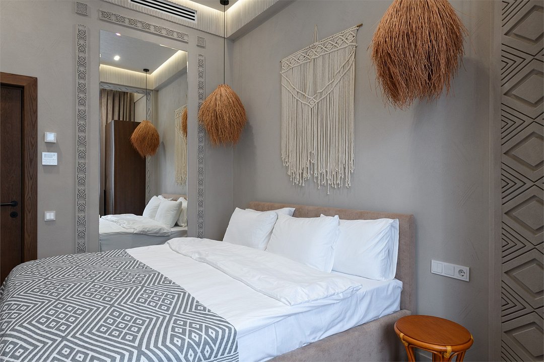Просторный двухкомнатный номер площадью от 33 м2 для комфортного отдыха и сна. В спальне - кровать king-size 180х200 см с ортопедическим матрасом и блекаут шторами. В дополнительной комнате предусмотрены две односпальные кровати 90х200 см. Интерьер номеров - это светлые природные оттенки, приглушенное дополнительное освещение, резьба по дереву, а также аутентичные предметы декора, изготовленные местными ремесленниками. В номере есть чайная станция и посуда для чаепития, мини-бар, сейф и телевизор с функцией Smart-TV. В санузле каждого гостя ждут халат и тапочки, комплект мягких махровых полотенец, приветственные косметические и гигиенические наборы.Услуги и удобства