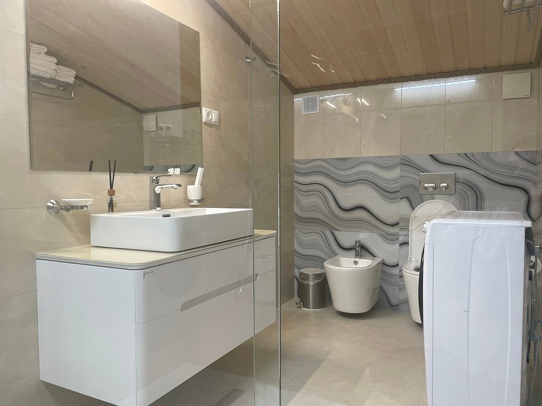 Номер для размещения 1-4 человек. Размер 102 кв. м. Большая двуспальная кровать Две односпальных кроватей Wi-fi Балкон с видом на море и двор Две ванных комнат c принадлежностями Кухня Стиральная машина Мини-бар, чайник и кофемашина Телевизор со Smart TV Кондиционер, тапочки, халаты, пляжные полотенца, гигиенические средства.Услуги и удобства