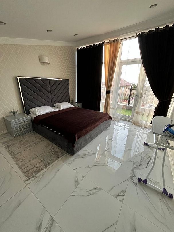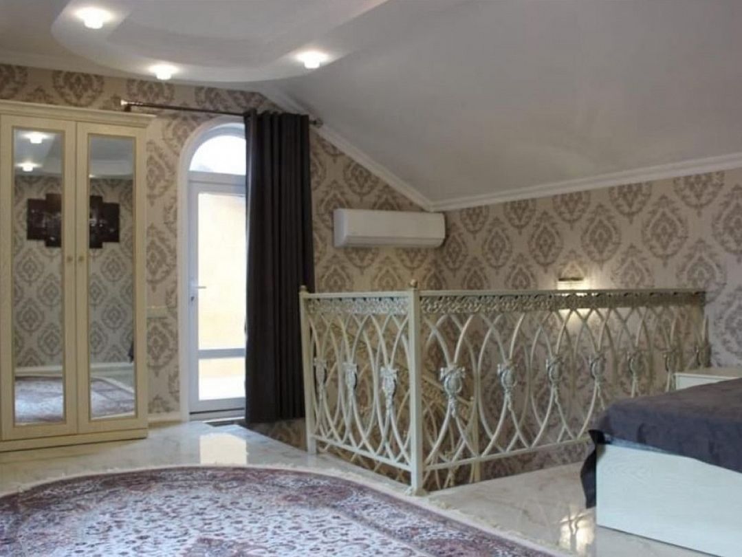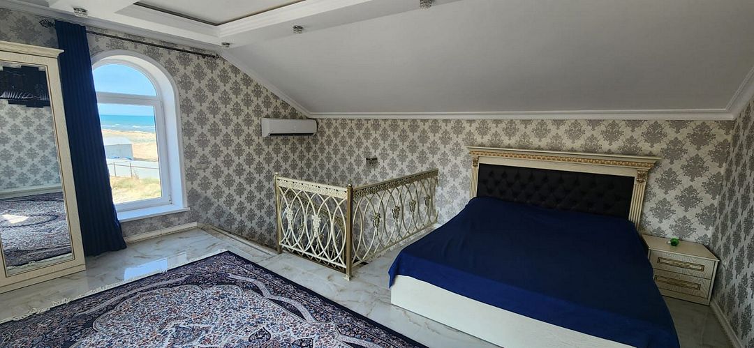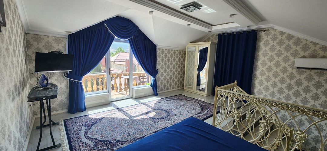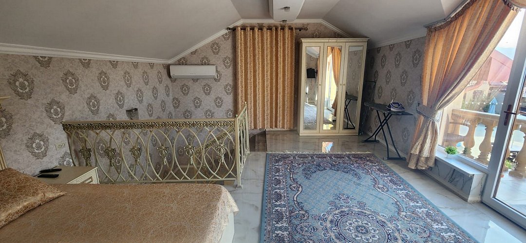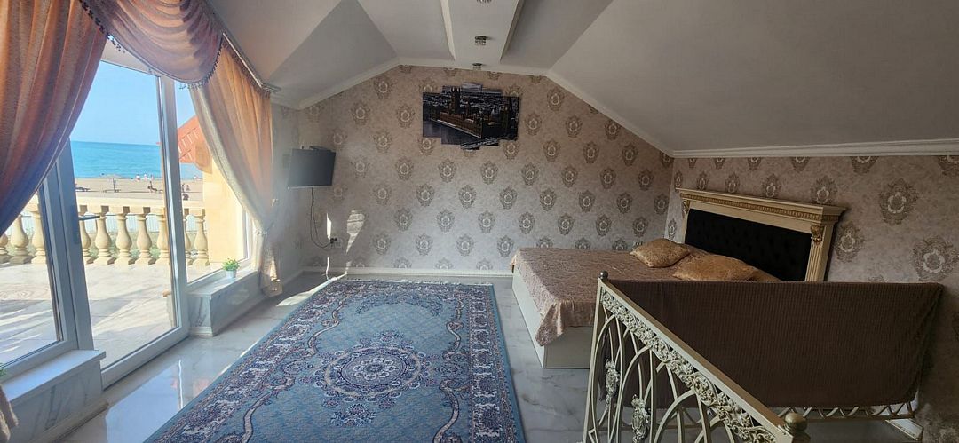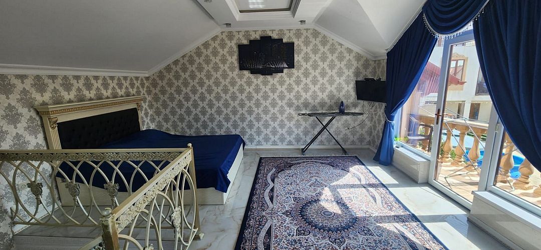 Вип номер площадью 130 кв.м с террасой и видом на море, горы. Подходит для размещения 6 человек. Имеет 2 спальни и гостиную с приятным интерьером. В номере: 2 двуспальнаые кровати, 1 двуспальный диван. Имеется телевизор, кондиционер, вентилятор, шкаф, вешалка, обеденный стол, комод, журнальный столик, плита, холодильник, СВЧ, чайник, стулья. Индивидуальная ванная комната: душ, раковина, туалет. В стоимость входит: Постельное бельё, полотенца, мыло. WI-Fi бесплатно на всей территории. Бесплатная частная парковка за территорией.Спальные места