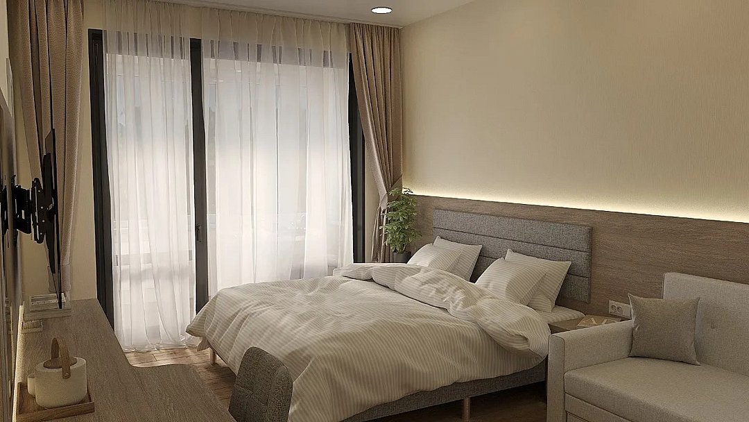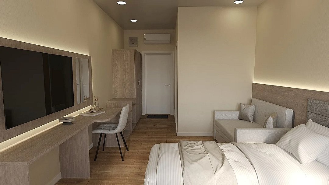 Standard Double Room — компактный и продуманный номер для комфортного размещения до трёх гостей. Площадь номера без учёта балкона составляет 18 м². В комнате — удобная двуспальная кровать с качественным постельным бельём и раскладное кресло, которое может использоваться как дополнительное спальное место для взрослого или ребёнка. Интерьер выполнен в спокойных нейтральных тонах, создающих ощущение уюта и лёгкости. Большие панорамные окна наполняют номер естественным светом, а выход на балкон позволяет приятно провести время на свежем воздухе. В жаркие дни комфортную температуру поддерживает кондиционер. Для отдыха и удобства гостей предусмотрены телевизор с функцией Smart TV, рабочая зона и Wi-Fi. В номере также есть чайная станция, бутилированная вода и мини-бар. Ванная комната оборудована душевой кабиной, гигиеническим душем и феном. Гостям предоставляются полотенца, тапочки и набор туалетных принадлежностей.Услуги и удобства