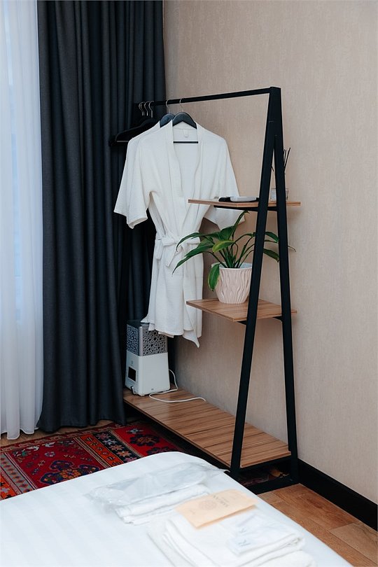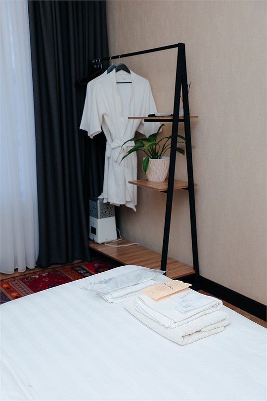 телевизор, Wi-Fi, кондиционер, светильник, фен, санузел, банные принадлежности, халаты, банные полотенца, тапочки, терраса, кровать «King size», вешалки, зеркало, ковер, чайный набор, чайник, отопление, душ, вид на город, стаканы, стул, стол, тумба, туалетные средства, москитная сетка, номер для некурящих, онлайн-регистрация до заезда, вешалки-плечики, бутилированная вода, затемняющая штора, онлайн-регистрацияВ гостиничном номере