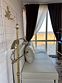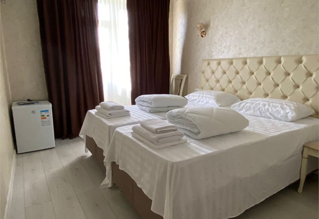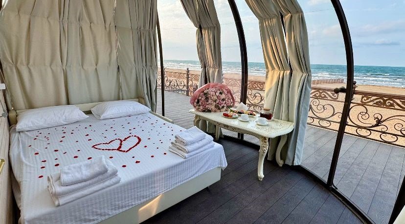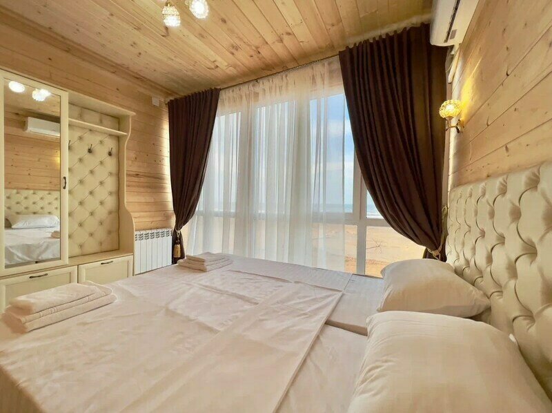 Двухместный номер с видом на море и с выходом на пляж и террасой. В номере санузел, ортопедические спальные боксы с высокими матрацами, гипоаллергенные спальные принадлежности, белоснежное белье и полотенца. Номер оборудован в светлых тонах. В номере имеется кондиционер, холодильник, телевизор смарт тв, чайник. Вид из окна на побережье Каспийского моря.