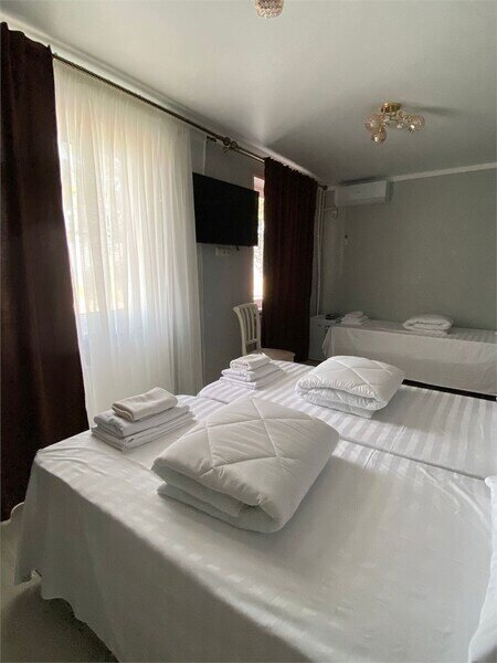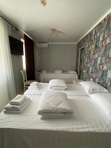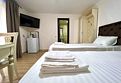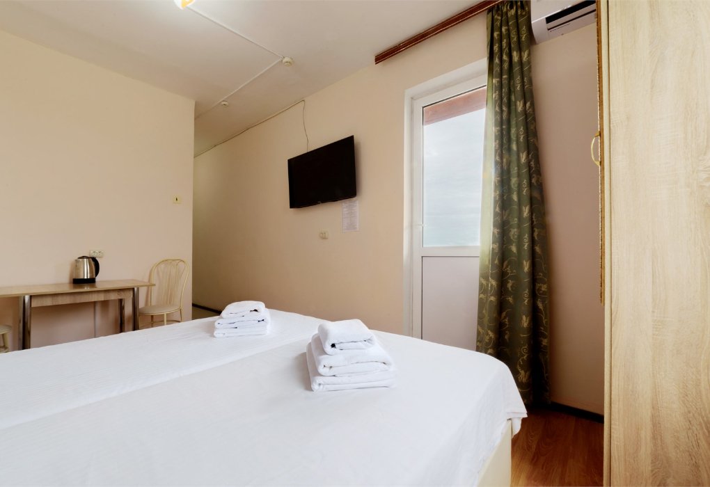 Комфортабельный семейный 2-х комнатный номер с балконом с видом на море с собственной душевой комнатой и санузлом, спальные места оборудованы высокими ортопедическими матрацами, белоснежное белье, гипоаллергенные подушки и одеяла. Кондиционер в каждой комнате. Телевизор смарт ТВ. Холодильник. Чайник. Фен. Банные полотенца и полотенца для лица.