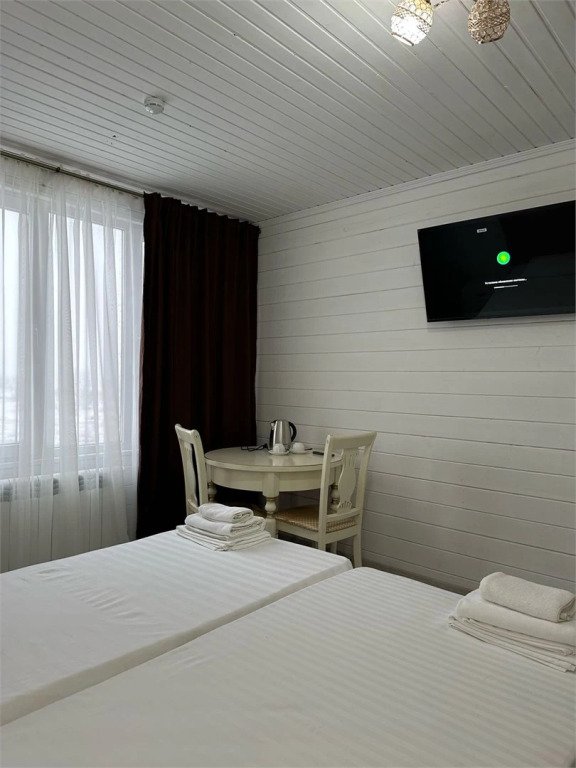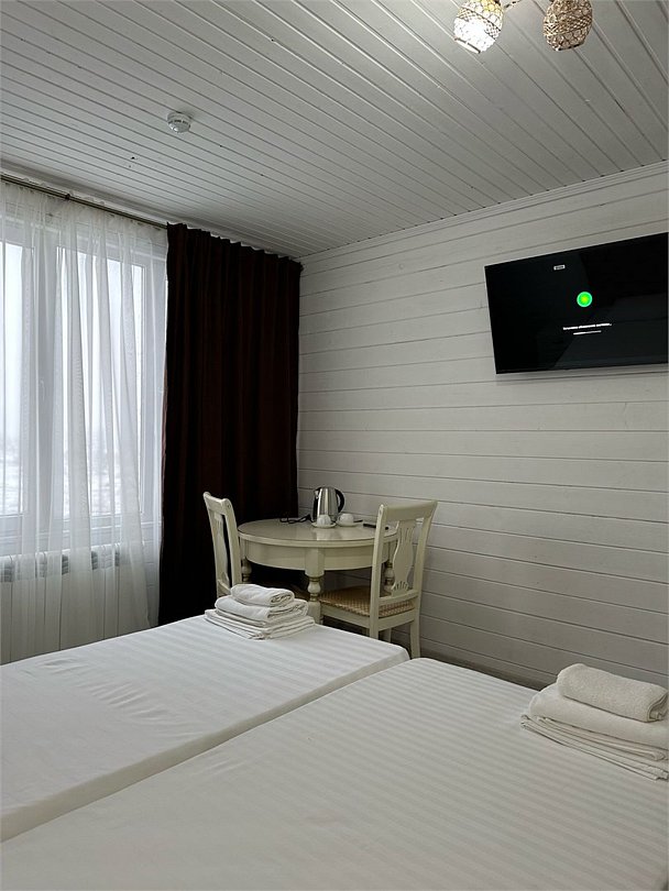 В номере: 2 кровати (90х190 см), тумбочка, шкаф, стол, стулья, санузел с душевой кабиной, телевизор, чайник.