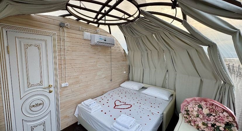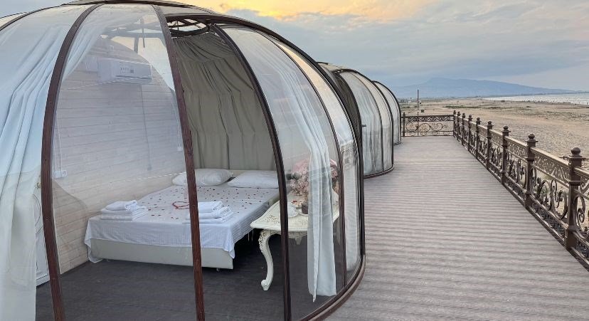 Купольный шатер с панорамными окнами с санузлом и кондиционером. Двухместное размещение на комфортном раскладном диване, белоснежное белье и гипоаллергенные постельные принадлежности. Потрясающий вид на море и пляж.