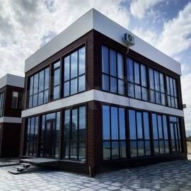 Смотровая зона с панорамными окнами с комфортным диваном. Коттедж подключен к сети Wi-fi, есть телевидение, чайник, кондиционер, холодильник.