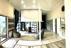 Гостиная зона с камином, проектором, Hi-Fi аппаратурой и виниловым проигрывателем создает атмосферу уюта и расслабления. Это место, где можно собраться всей семьей или компанией друзей, чтобы насладиться вечером за просмотром фильмов или прослушиванием музыки.