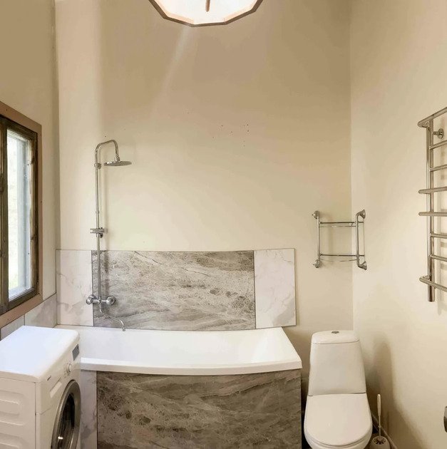 В доме два санузла: в первом установлены ванна, стиральная машина, раковина и электрический полотенцесушитель, а во втором — душевая кабина, раковина и электрический полотенцесушитель.