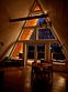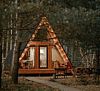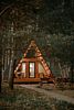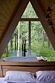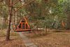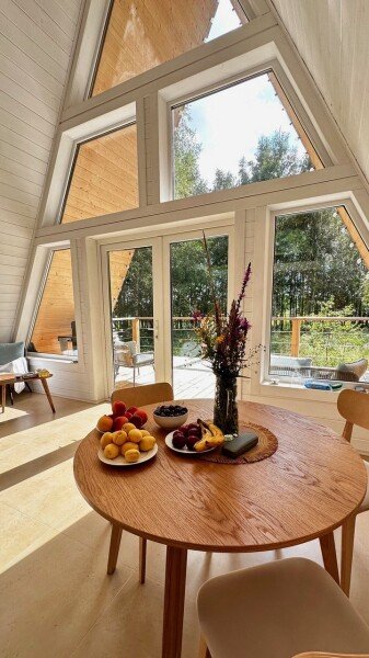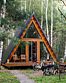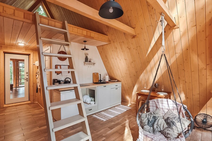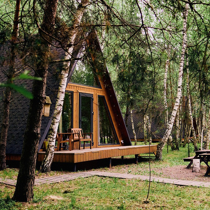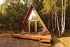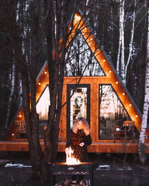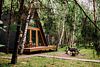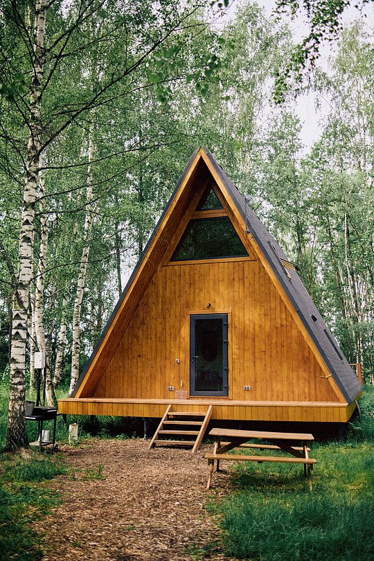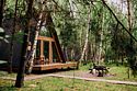 Треугольные строения напоминают шалаш, в котором на небольшой площади есть всё что нужно для отдыха. Они оснащены панорамным фасадом, а на втором уровне располагается кровать с отдельным окном с видом на лес. Возле каждого строения имеется гамак и площадка с мангалом для барбекю.