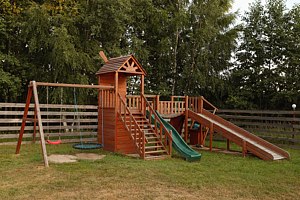 На детской площадке есть обычные качели и «подвесное гнездо», которое особенно нравится детям. Пластиковая горка работает в любое время года, но для отрицательных температур есть зимняя горка, на ней катание приносит особенную радость.