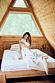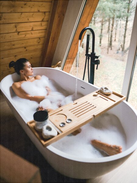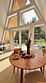 Уникальный треугольный дом с отдельно стоящей ванной у панорамного окна с видом на хвойный лес.