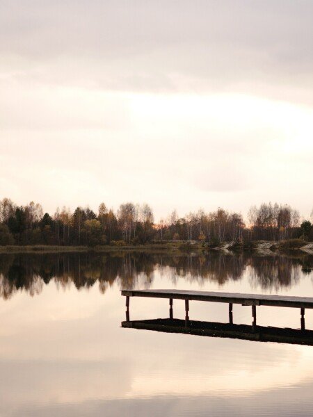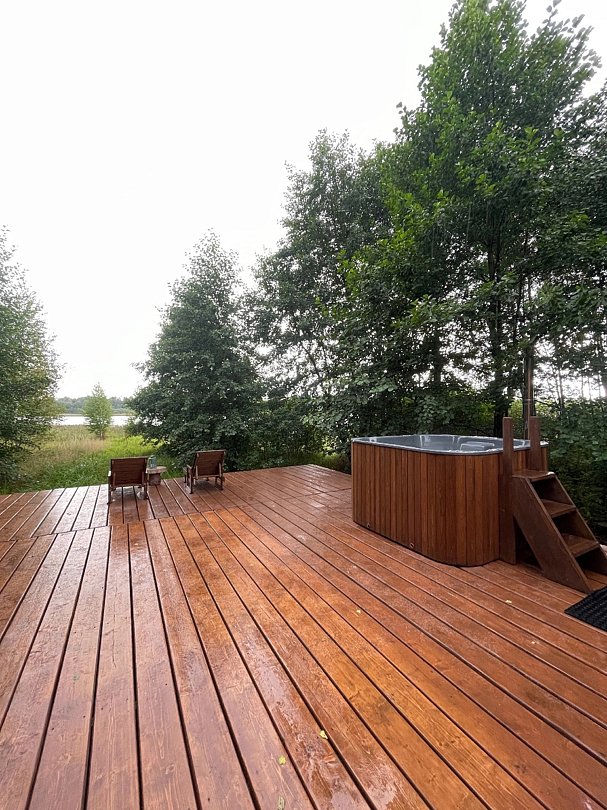 Домик находится на территории семейной фермы, в окружении соснового леса и на берегу водоёма.