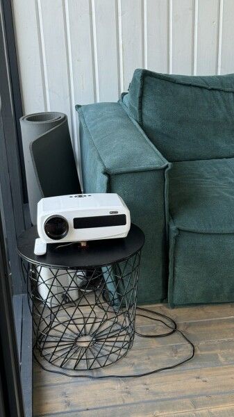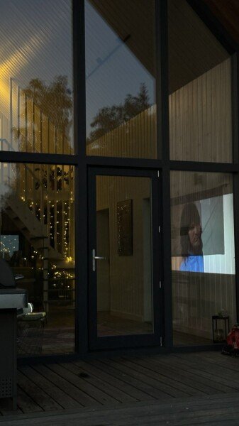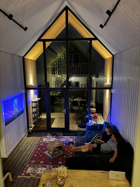 Панорамные окна гостиной смотрят на лес. В доме колонка Алиса, проектор. После зимних прогулок можно укутаться в плед и смотреть фильмы. Или играть в настольные игры, их достаточное количество.