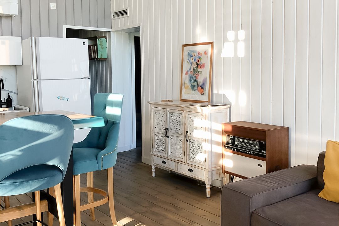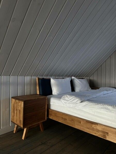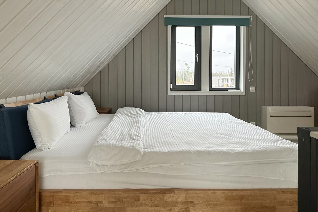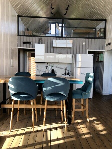 Внутри вас ждут две уютные спальни на первом этаже — одна с двуспальной кроватью, а другая с двумя односпальными, а также комфортабельная спальня на втором этаже. Просторная гостиная и полностью укомплектованная кухня станут прекрасной площадкой для кулинарных экспериментов. Вы сможете приготовить блюда из свежих продуктов и насладиться ими за обеденным столом, любуясь восхитительными видами на природу.