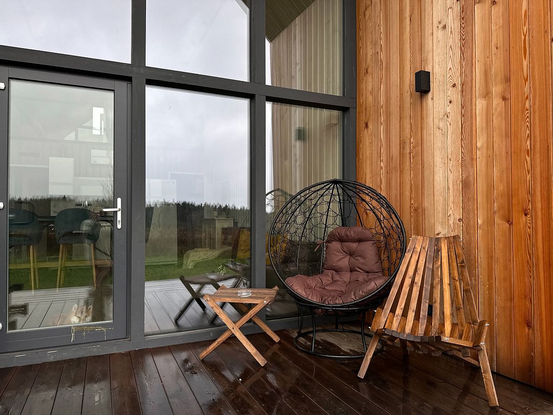 Великолепными видами на окружающую природу можно наслаждаться с просторной террасы, где Вы можете отдохнуть на удобных креслах, наслаждаясь пока еще теплым солнцем. Вечером Вас ждет удивительное звездное небо, которое создаст романтическую атмосферу для вечерних прогулок или ужина на открытом воздухе.