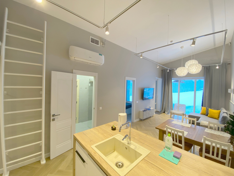 2 двуспальные кровати, 2 сан. узла, сауна, стир. машина, мини-кухня, смарт тв