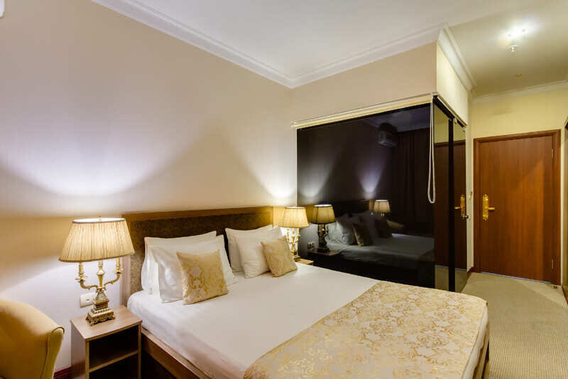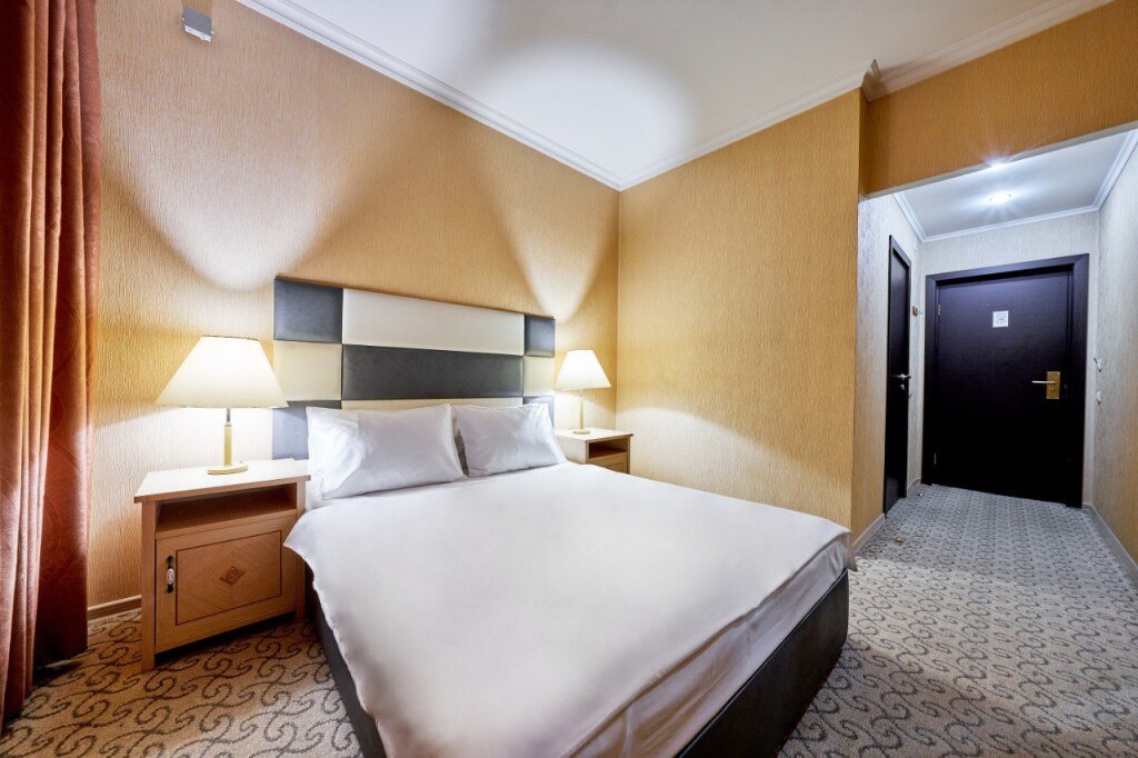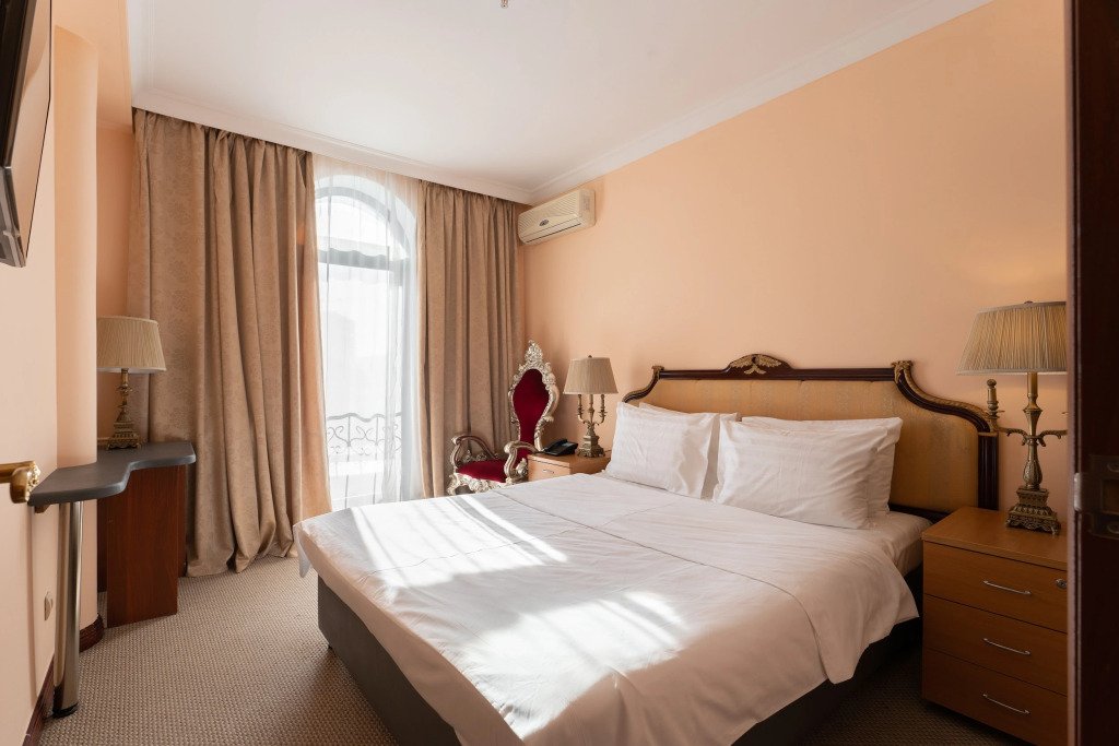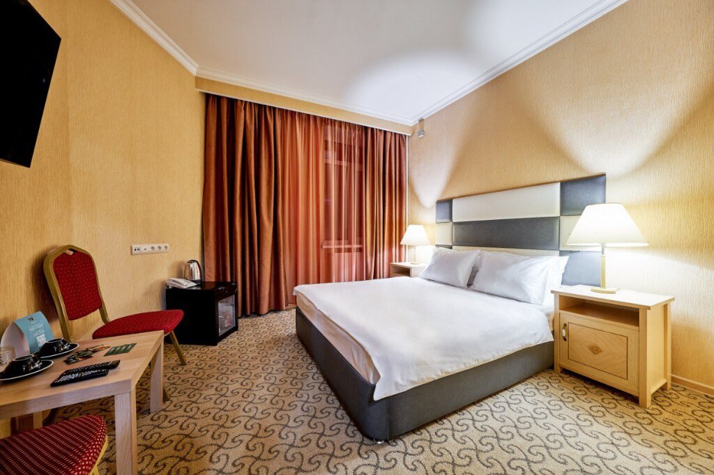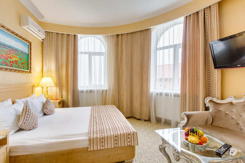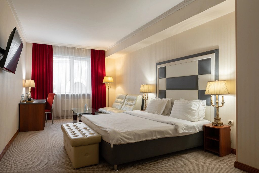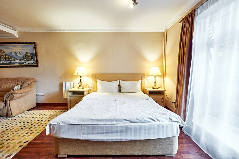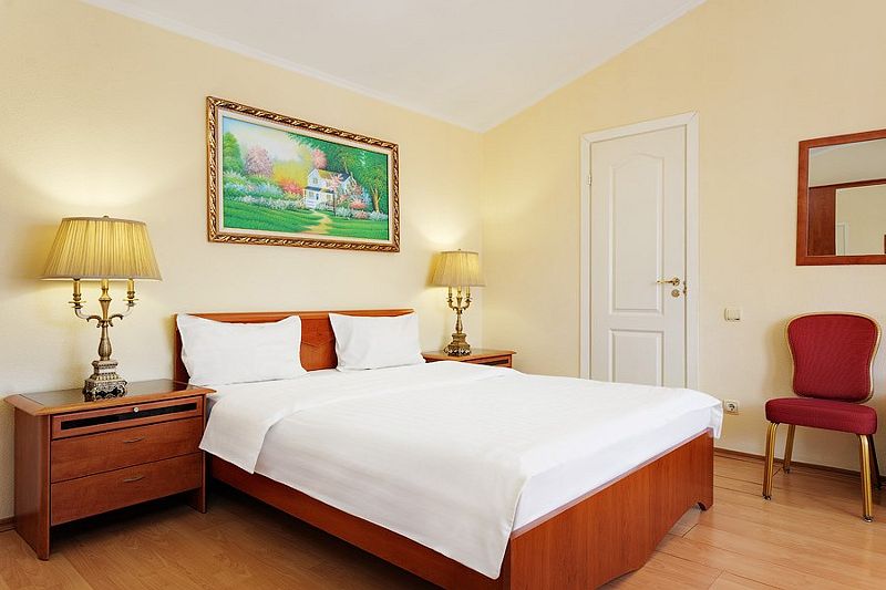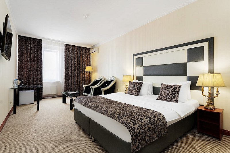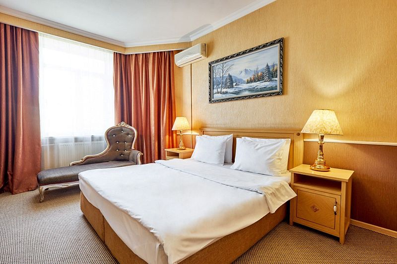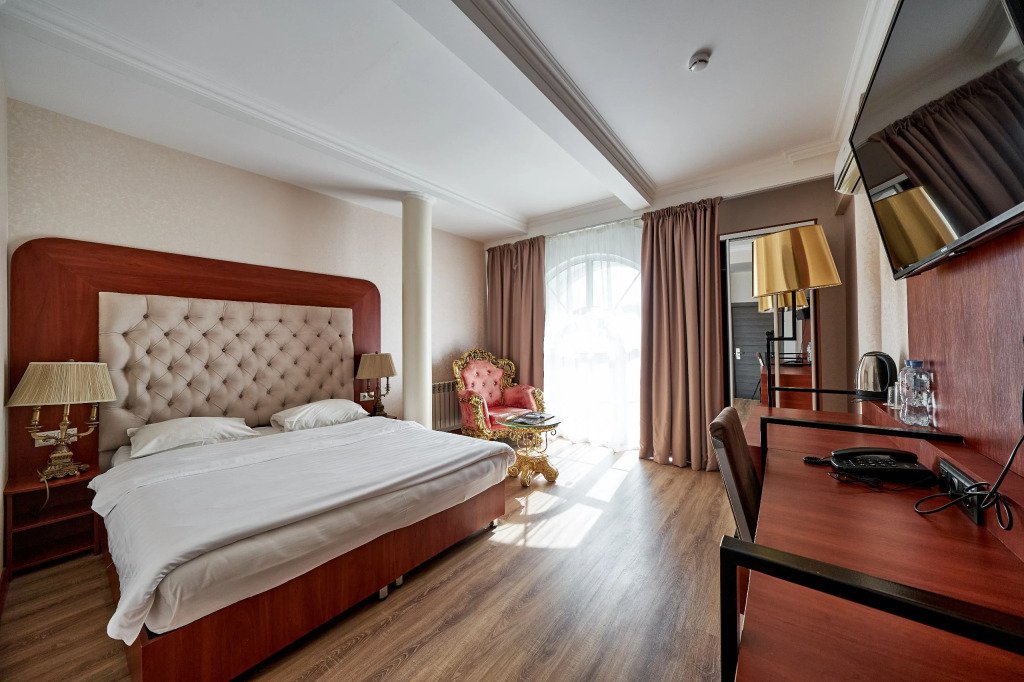 Шикарный номер категории «Люкс» – оптимальный выбор для солидного человека, влюбленной пары, молодоженов. Просторный и комфортный, с тщательно продуманным интерьером — здесь есть все, что может понадобиться вам во время отдыха. Интерьер выдержан в приятной теплой гамме, которая располагает к спокойному отдыху после насыщенного дня. Широкая двухместная кровать размера «King Size» снабжена ортопедическим матрасом, который гарантирует великолепный сон, а современная система климат-контроля обеспечит оптимальную температуру и максимальный уют в номере. В номере есть удобный письменный стол и высокоскоростной Wi-Fi, а также индивидуальный сейф для ценных вещей и документов. Номера укомплектованы мини-баром, чайной станцией, телефоном, феном, гладильными принадлежностями и халатами. Ежедневно при жилой уборке происходит пополнение гигиенических принадлежностей, питьевой воды. Мини-бар не входит в стоимость номера и оплачивается отдельно. Под запрос предоставляются косметический и бритвенный наборы. Окна номера выходят на тихую улицу, внутренний двор и на город, так что можете быть уверены: вашему отдыху не помешает шум.