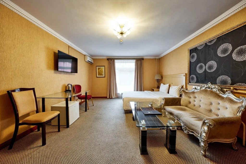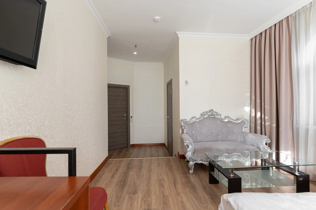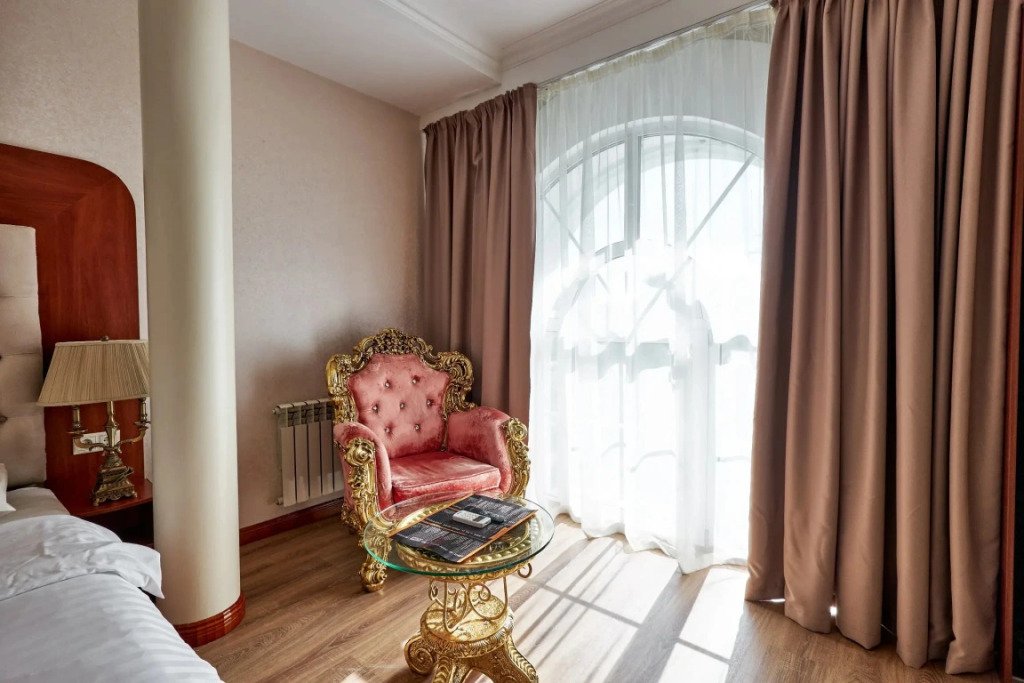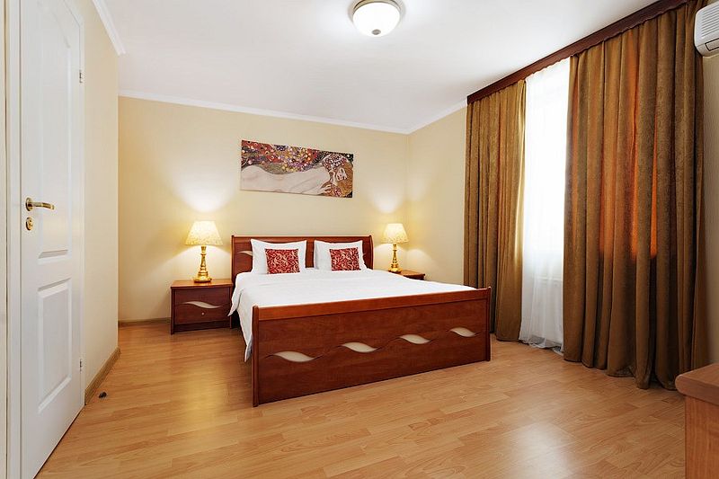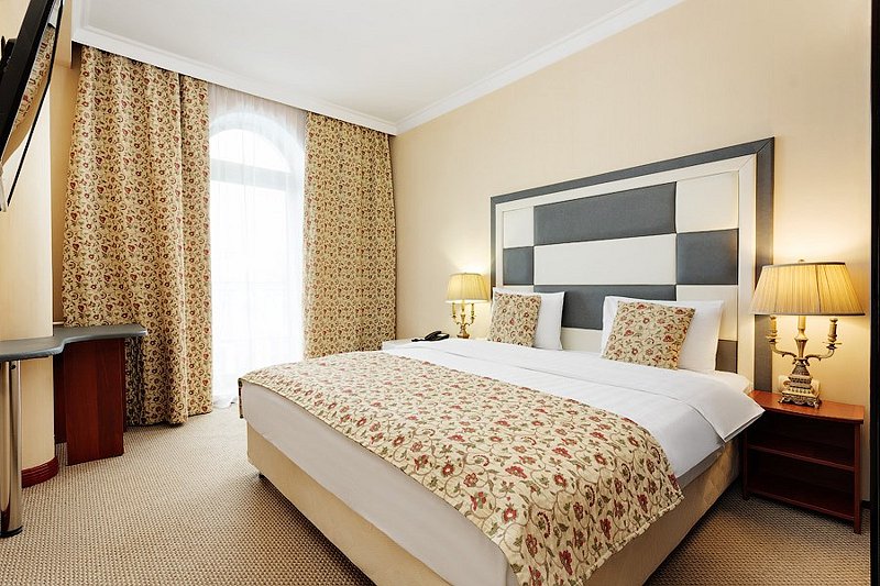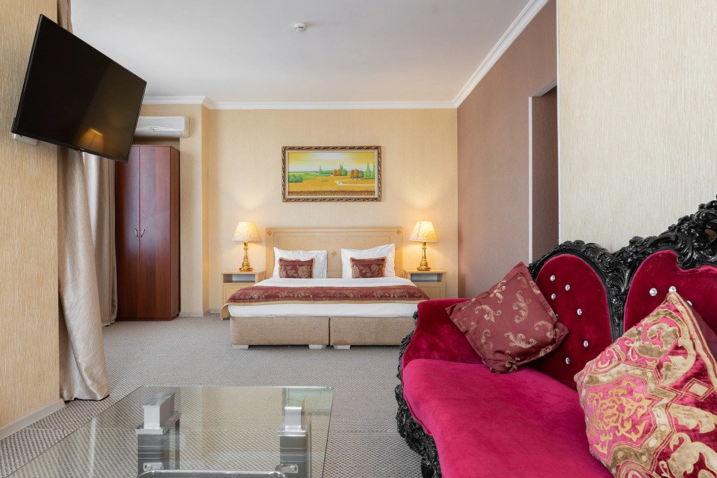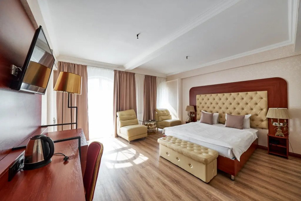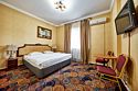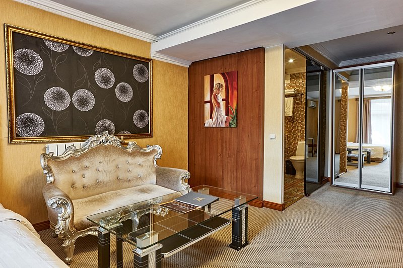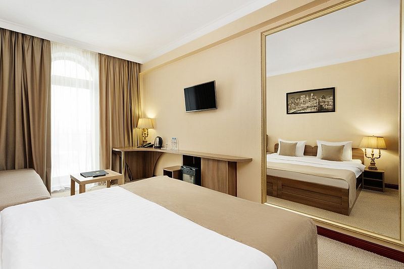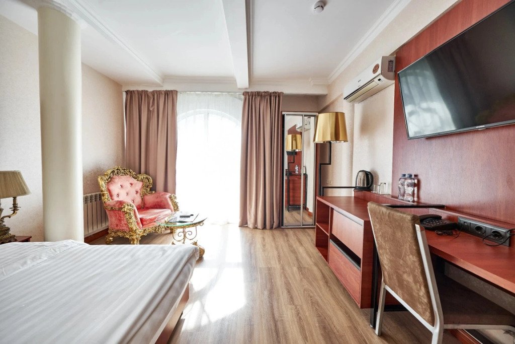 Шикарный номер категории «Люкс» – оптимальный выбор для солидного человека, влюбленной пары, молодоженов. Просторный и комфортный, с тщательно продуманным интерьером — здесь есть все, что может понадобиться вам во время отдыха. Интерьер выдержан в приятной теплой гамме, которая располагает к спокойному отдыху после насыщенного дня. Широкая двухместная кровать размера «King Size» снабжена ортопедическим матрасом, который гарантирует великолепный сон, а современная система климат-контроля обеспечит оптимальную температуру и максимальный уют в номере. В номере есть удобный письменный стол и высокоскоростной Wi-Fi, а также индивидуальный сейф для ценных вещей и документов. Номера укомплектованы мини-баром, чайной станцией, телефоном, феном, гладильными принадлежностями и халатами. Ежедневно при жилой уборке происходит пополнение гигиенических принадлежностей, питьевой воды. Мини-бар не входит в стоимость номера и оплачивается отдельно. Под запрос предоставляются косметический и бритвенный наборы. Окна номера выходят на тихую улицу, внутренний двор и на город, так что можете быть уверены: вашему отдыху не помешает шум.