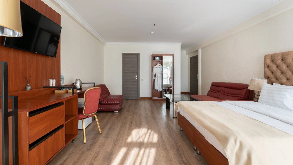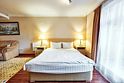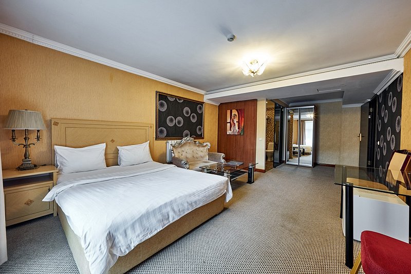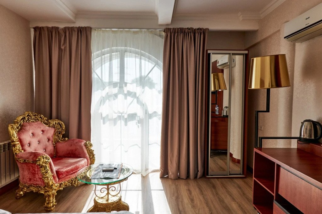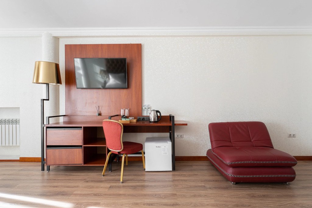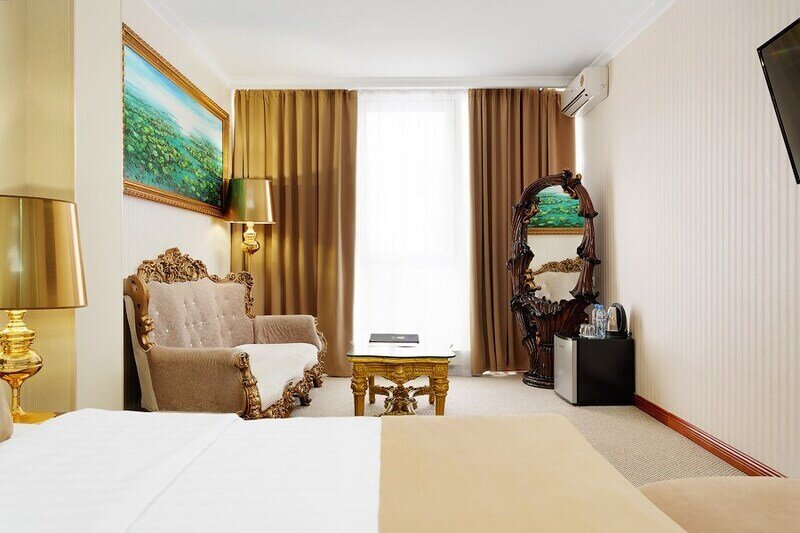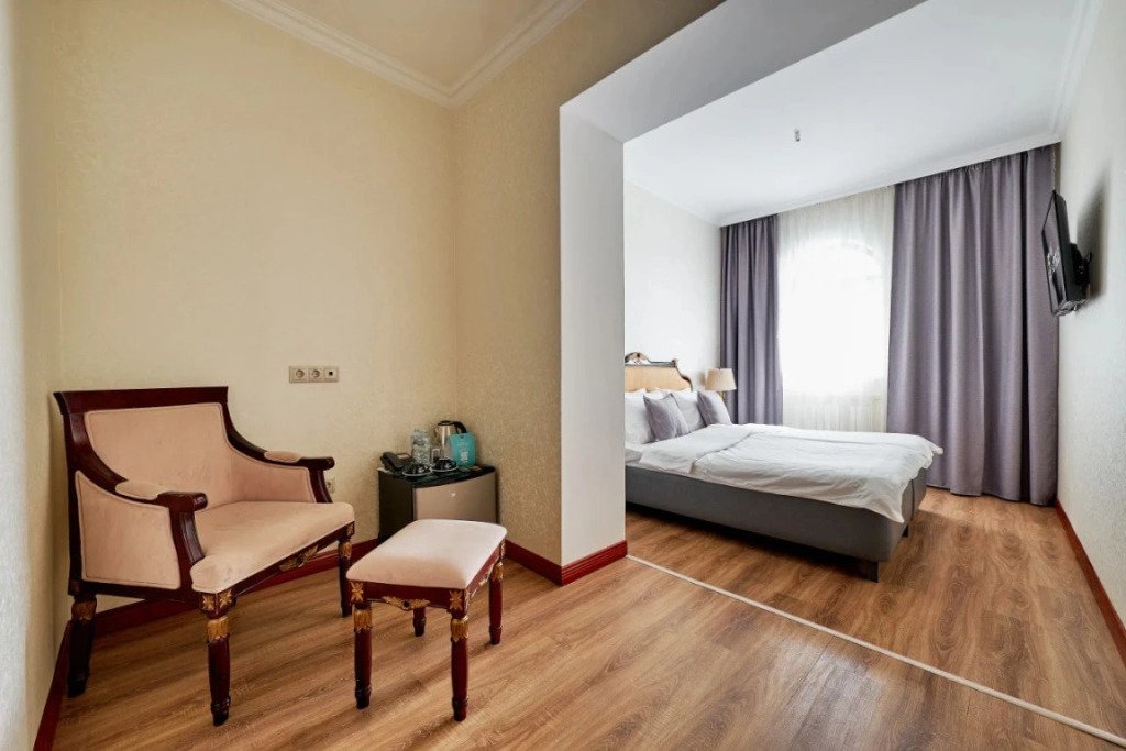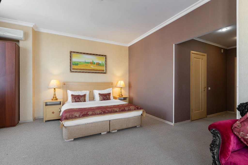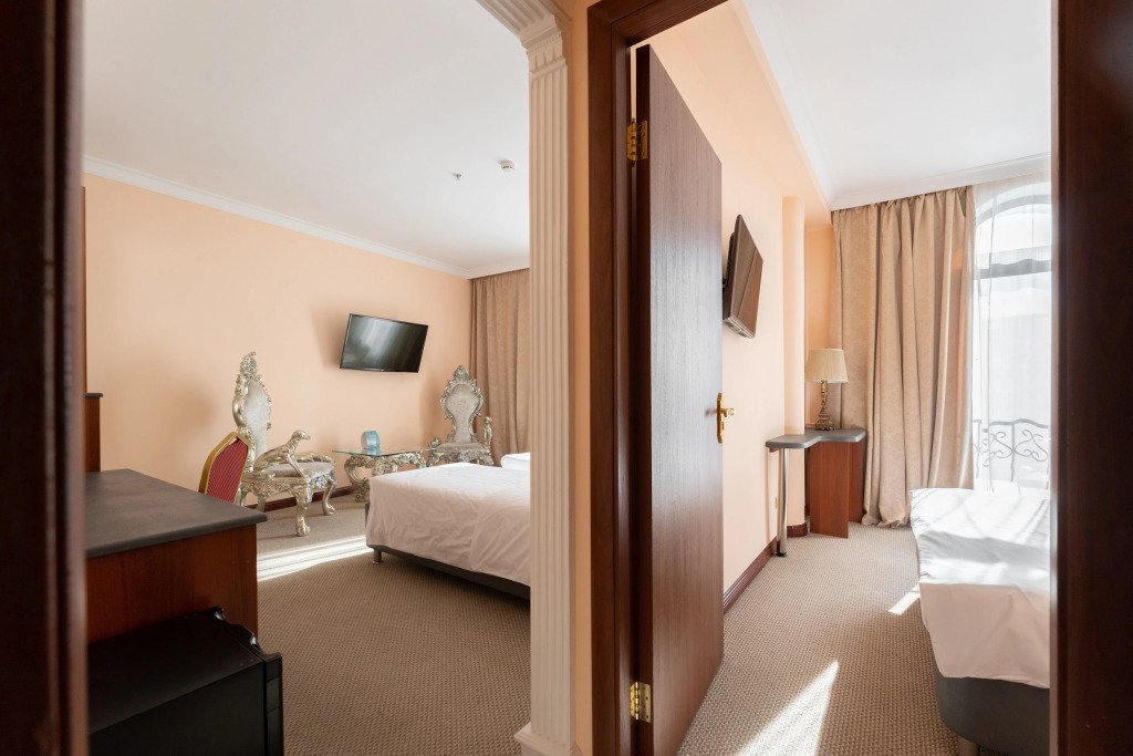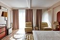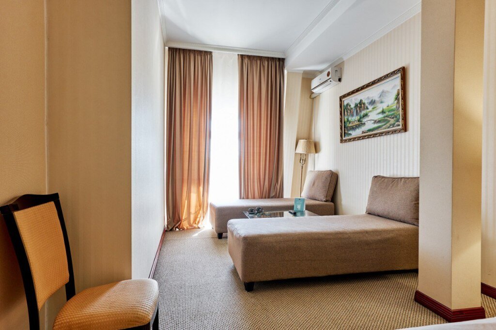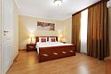 Шикарный номер категории «Люкс» – оптимальный выбор для солидного человека, влюбленной пары, молодоженов. Просторный и комфортный, с тщательно продуманным интерьером — здесь есть все, что может понадобиться вам во время отдыха. Интерьер выдержан в приятной теплой гамме, которая располагает к спокойному отдыху после насыщенного дня. Широкая двухместная кровать размера «King Size» снабжена ортопедическим матрасом, который гарантирует великолепный сон, а современная система климат-контроля обеспечит оптимальную температуру и максимальный уют в номере. В номере есть удобный письменный стол и высокоскоростной Wi-Fi, а также индивидуальный сейф для ценных вещей и документов. Номера укомплектованы мини-баром, чайной станцией, телефоном, феном, гладильными принадлежностями и халатами. Ежедневно при жилой уборке происходит пополнение гигиенических принадлежностей, питьевой воды. Мини-бар не входит в стоимость номера и оплачивается отдельно. Под запрос предоставляются косметический и бритвенный наборы. Окна номера выходят на тихую улицу, внутренний двор и на город, так что можете быть уверены: вашему отдыху не помешает шум.