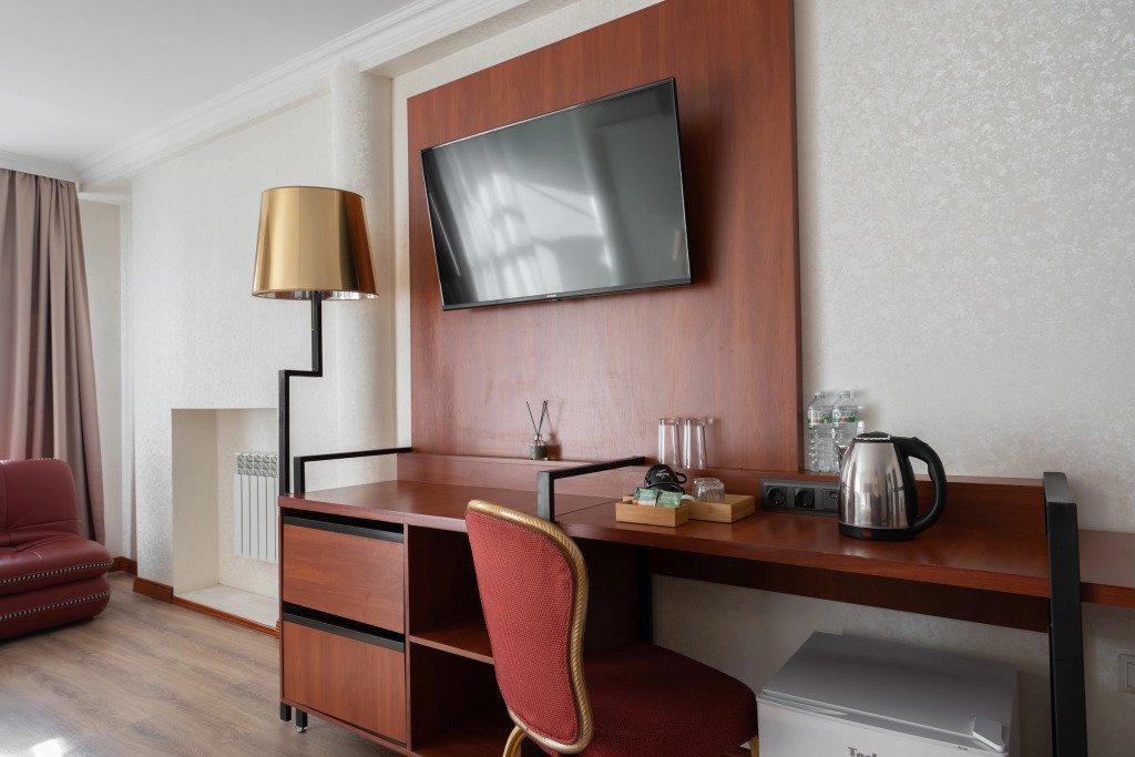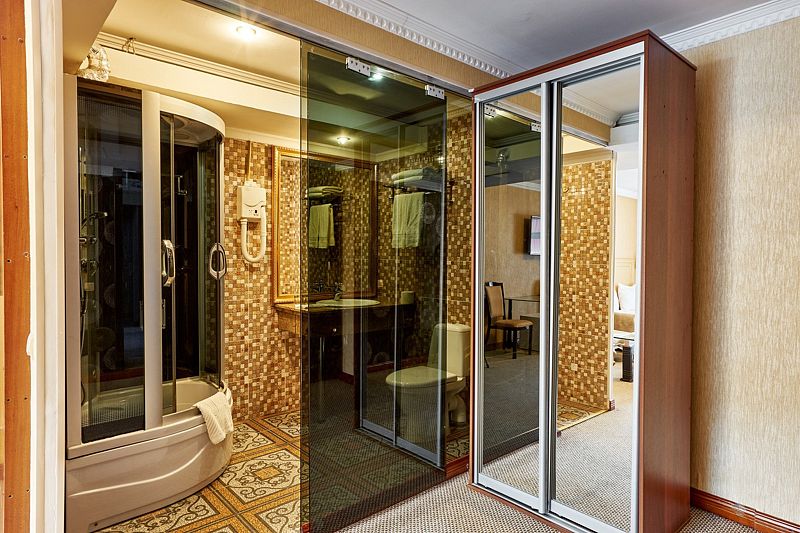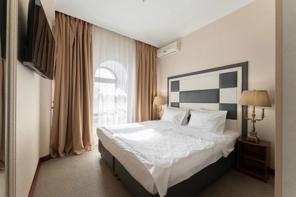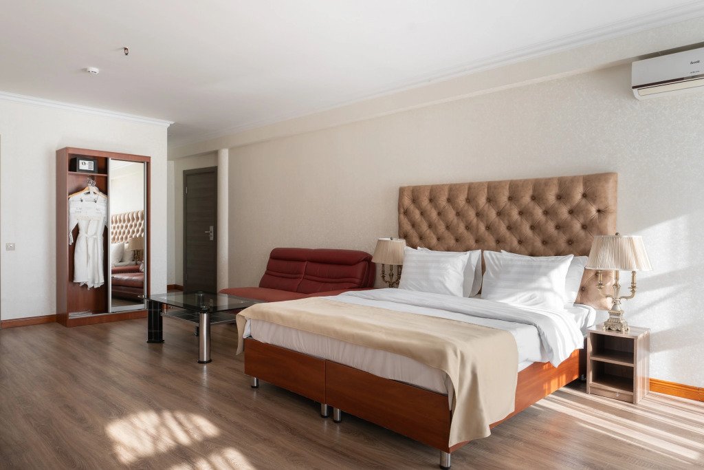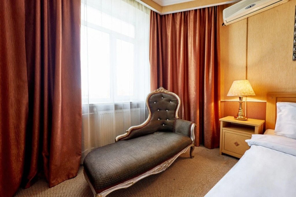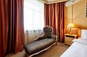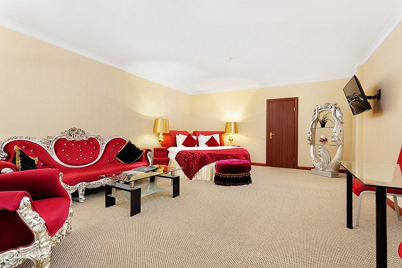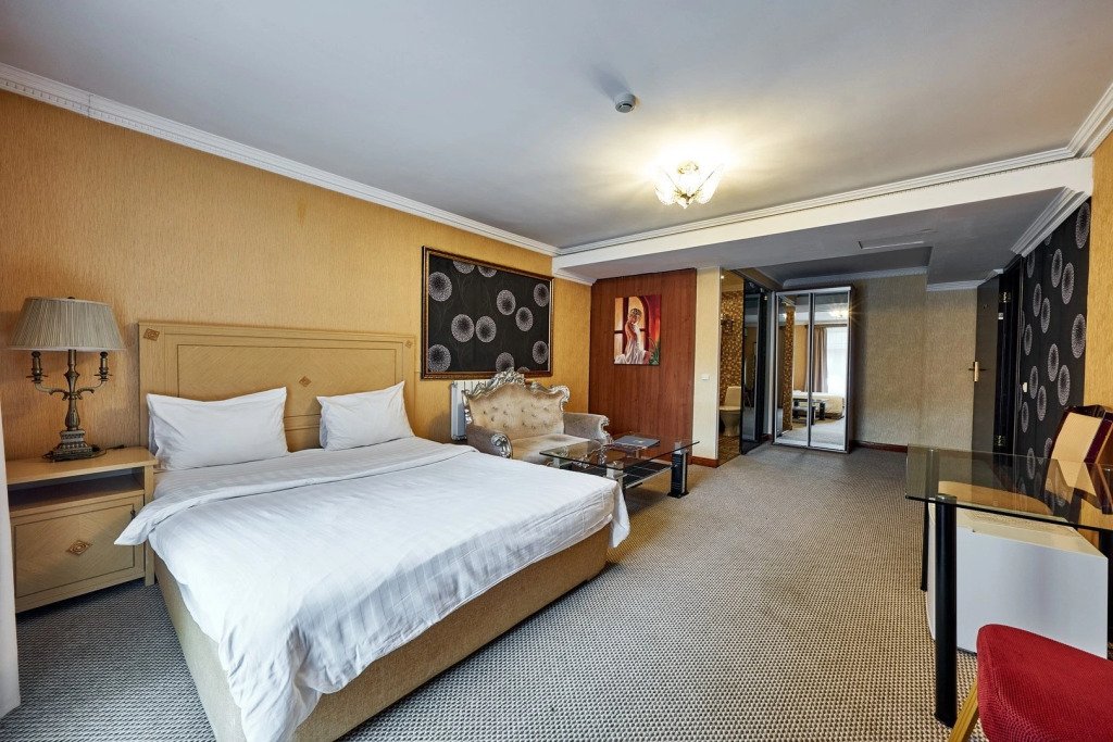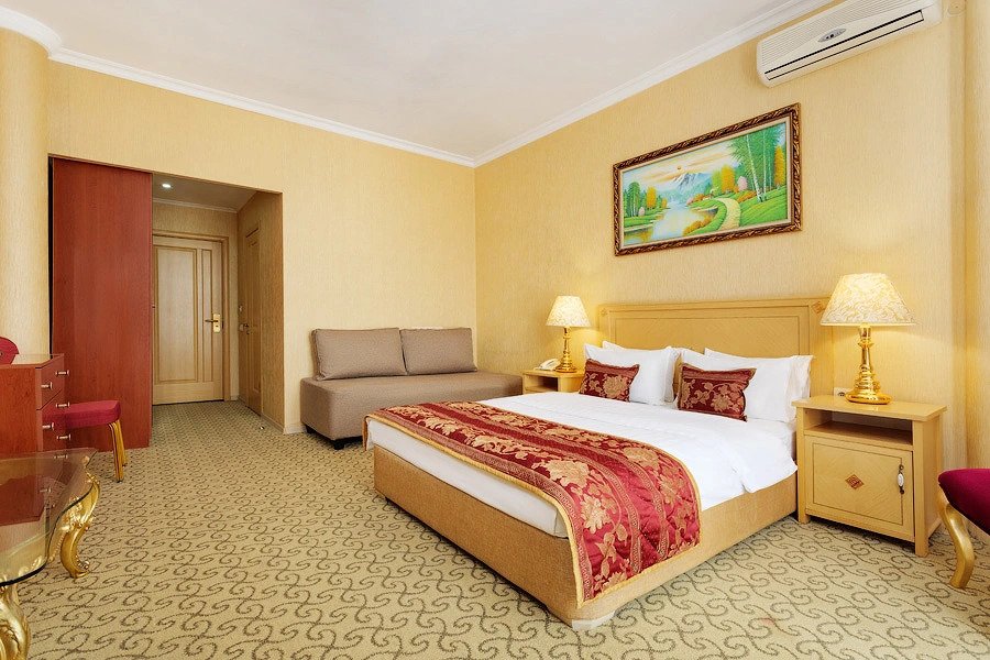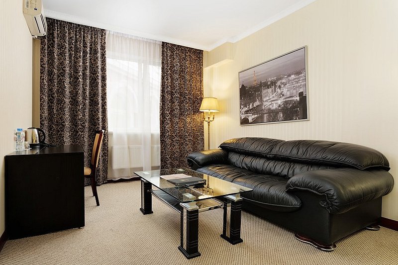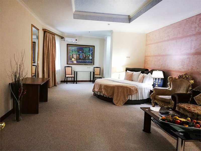 Шикарный номер категории «Люкс» – оптимальный выбор для солидного человека, влюбленной пары, молодоженов. Просторный и комфортный, с тщательно продуманным интерьером — здесь есть все, что может понадобиться вам во время отдыха. Интерьер выдержан в приятной теплой гамме, которая располагает к спокойному отдыху после насыщенного дня. Широкая двухместная кровать размера «King Size» снабжена ортопедическим матрасом, который гарантирует великолепный сон, а современная система климат-контроля обеспечит оптимальную температуру и максимальный уют в номере. В номере есть удобный письменный стол и высокоскоростной Wi-Fi, а также индивидуальный сейф для ценных вещей и документов. Номера укомплектованы мини-баром, чайной станцией, телефоном, феном, гладильными принадлежностями и халатами. Ежедневно при жилой уборке происходит пополнение гигиенических принадлежностей, питьевой воды. Мини-бар не входит в стоимость номера и оплачивается отдельно. Под запрос предоставляются косметический и бритвенный наборы. Окна номера выходят на тихую улицу, внутренний двор и на город, так что можете быть уверены: вашему отдыху не помешает шум.