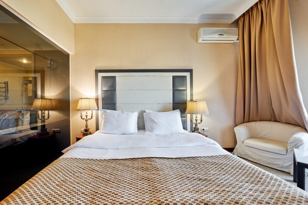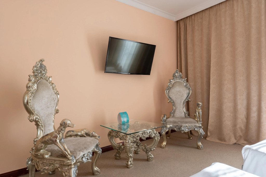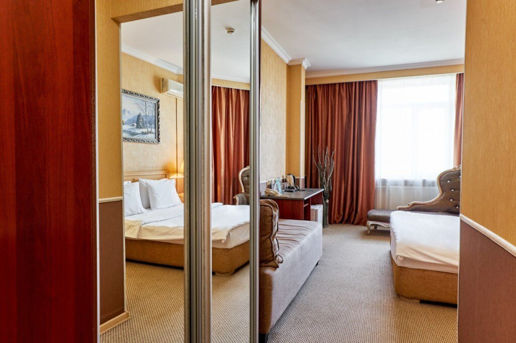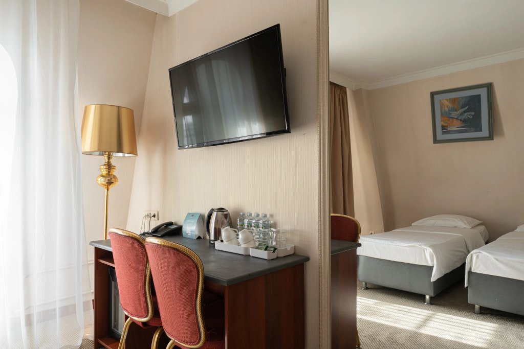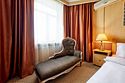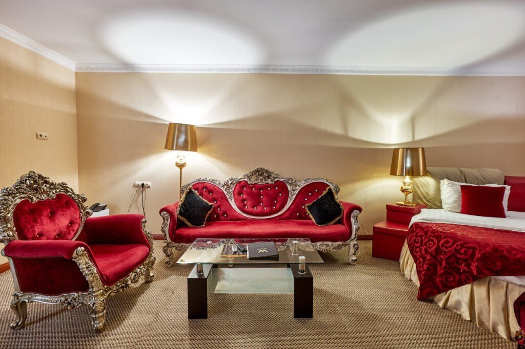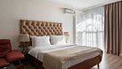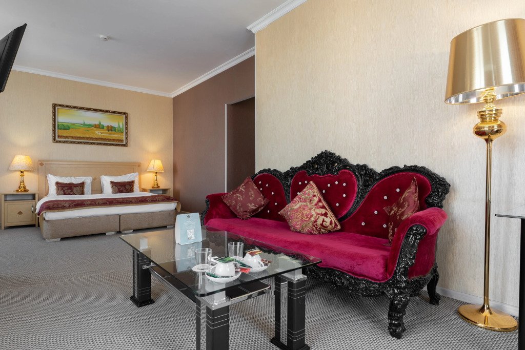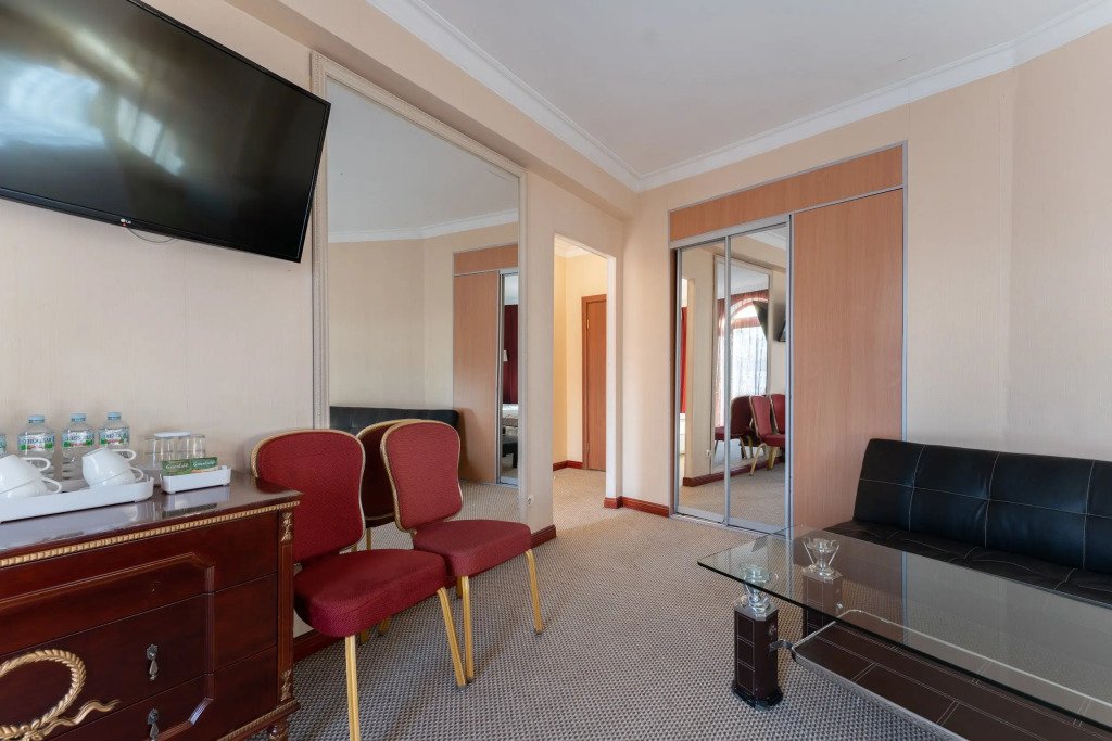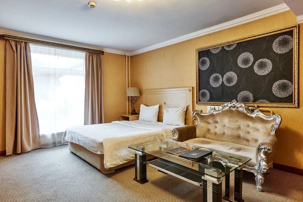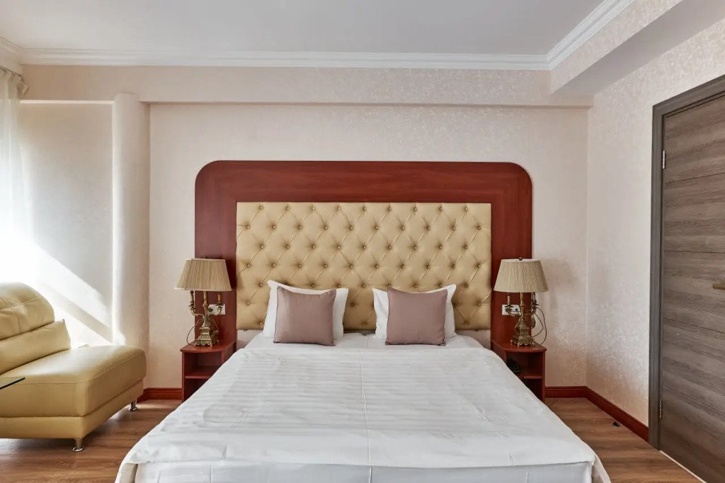 Шикарный номер категории «Люкс» – оптимальный выбор для солидного человека, влюбленной пары, молодоженов. Просторный и комфортный, с тщательно продуманным интерьером — здесь есть все, что может понадобиться вам во время отдыха. Интерьер выдержан в приятной теплой гамме, которая располагает к спокойному отдыху после насыщенного дня. Широкая двухместная кровать размера «King Size» снабжена ортопедическим матрасом, который гарантирует великолепный сон, а современная система климат-контроля обеспечит оптимальную температуру и максимальный уют в номере. В номере есть удобный письменный стол и высокоскоростной Wi-Fi, а также индивидуальный сейф для ценных вещей и документов. Номера укомплектованы мини-баром, чайной станцией, телефоном, феном, гладильными принадлежностями и халатами. Ежедневно при жилой уборке происходит пополнение гигиенических принадлежностей, питьевой воды. Мини-бар не входит в стоимость номера и оплачивается отдельно. Под запрос предоставляются косметический и бритвенный наборы. Окна номера выходят на тихую улицу, внутренний двор и на город, так что можете быть уверены: вашему отдыху не помешает шум.