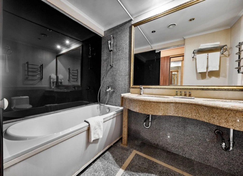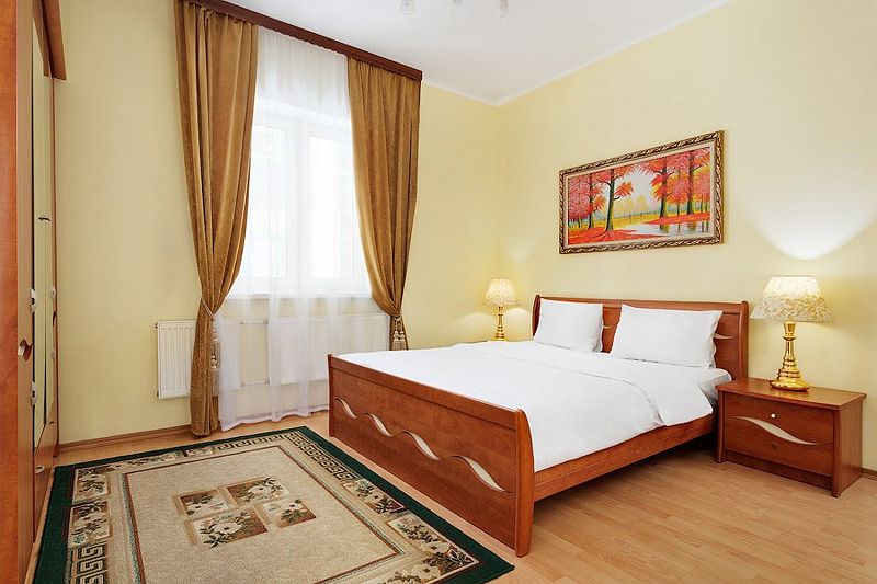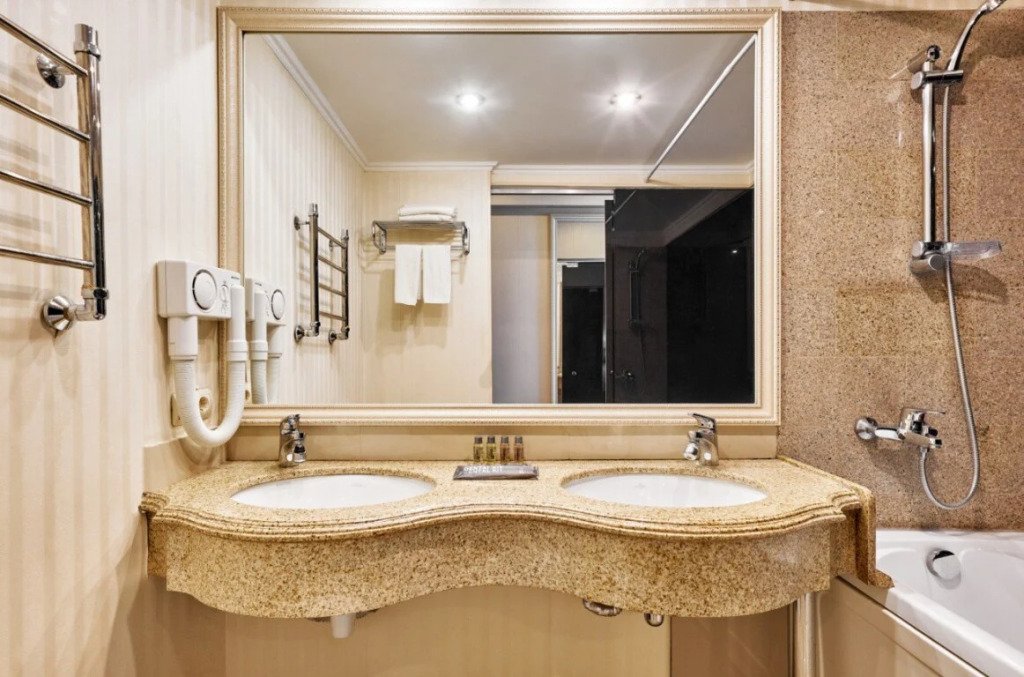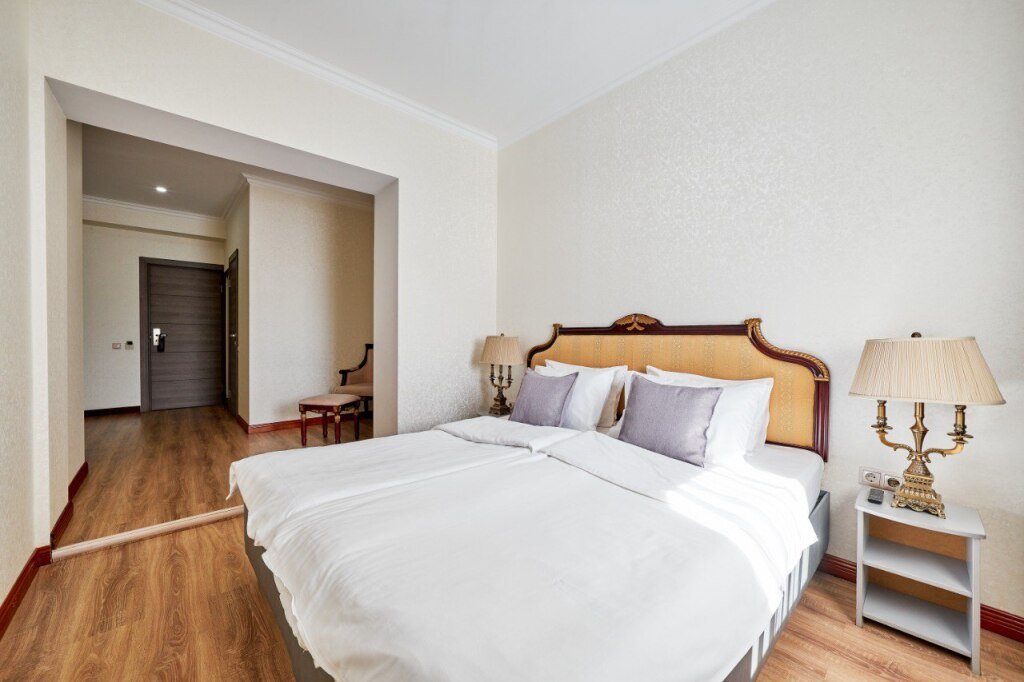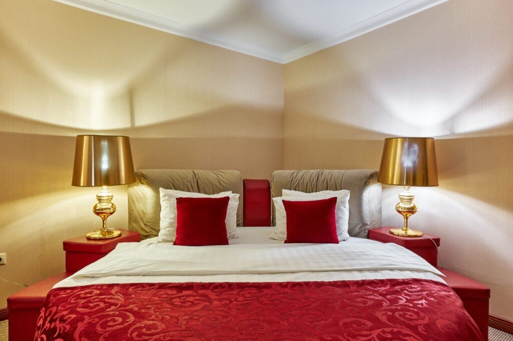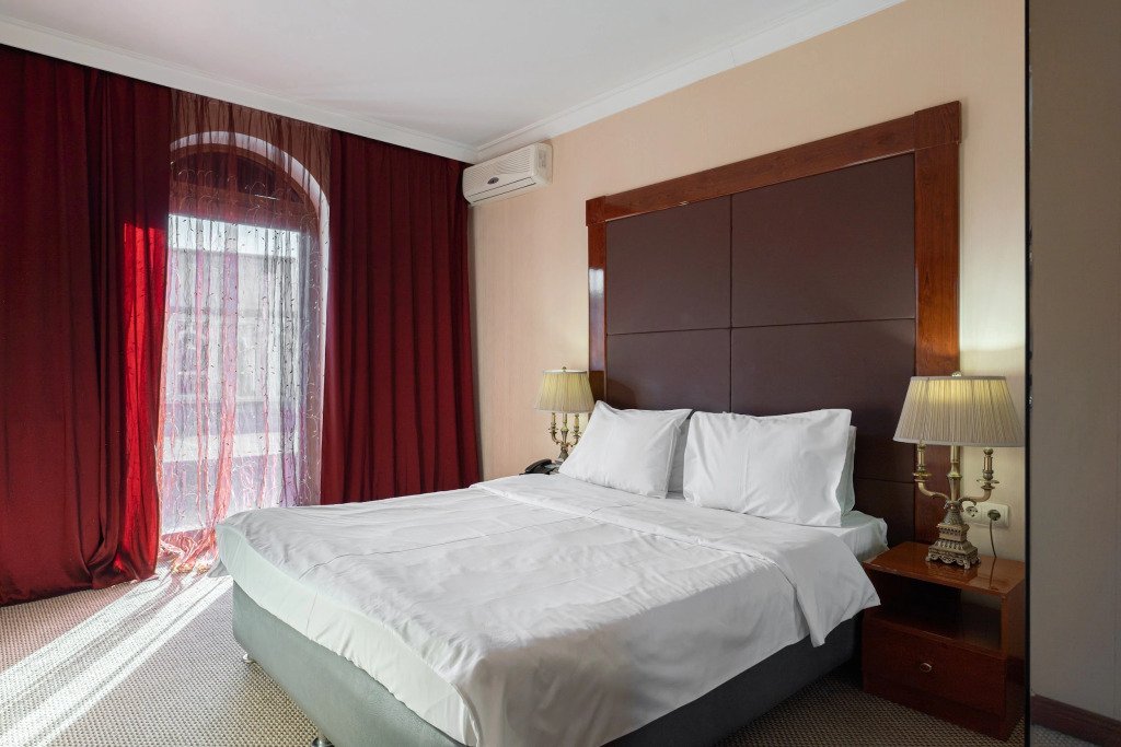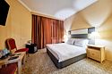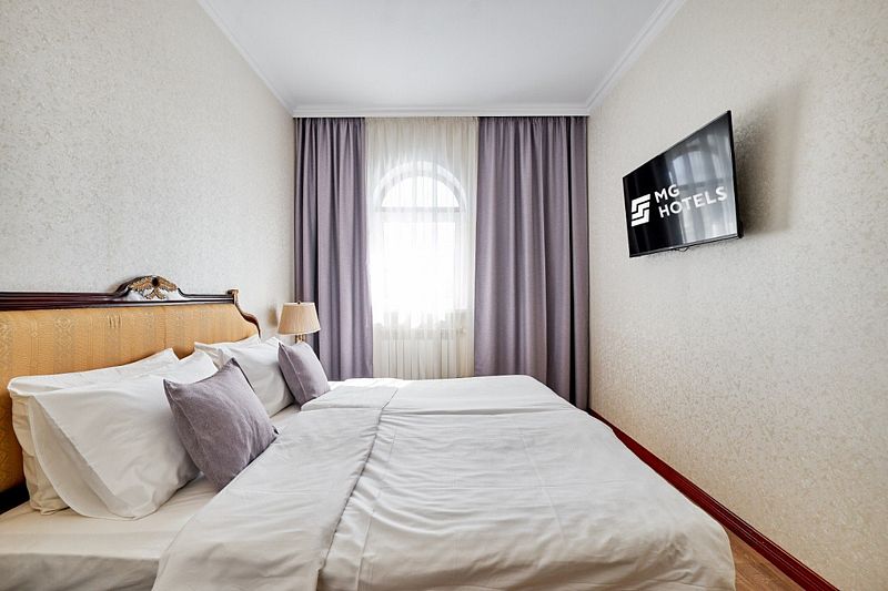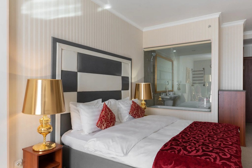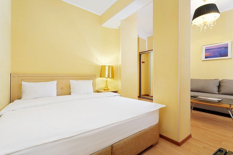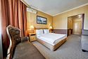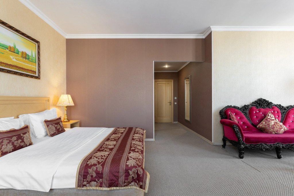 Шикарный номер категории «Люкс» – оптимальный выбор для солидного человека, влюбленной пары, молодоженов. Просторный и комфортный, с тщательно продуманным интерьером — здесь есть все, что может понадобиться вам во время отдыха. Интерьер выдержан в приятной теплой гамме, которая располагает к спокойному отдыху после насыщенного дня. Широкая двухместная кровать размера «King Size» снабжена ортопедическим матрасом, который гарантирует великолепный сон, а современная система климат-контроля обеспечит оптимальную температуру и максимальный уют в номере. В номере есть удобный письменный стол и высокоскоростной Wi-Fi, а также индивидуальный сейф для ценных вещей и документов. Номера укомплектованы мини-баром, чайной станцией, телефоном, феном, гладильными принадлежностями и халатами. Ежедневно при жилой уборке происходит пополнение гигиенических принадлежностей, питьевой воды. Мини-бар не входит в стоимость номера и оплачивается отдельно. Под запрос предоставляются косметический и бритвенный наборы. Окна номера выходят на тихую улицу, внутренний двор и на город, так что можете быть уверены: вашему отдыху не помешает шум.