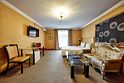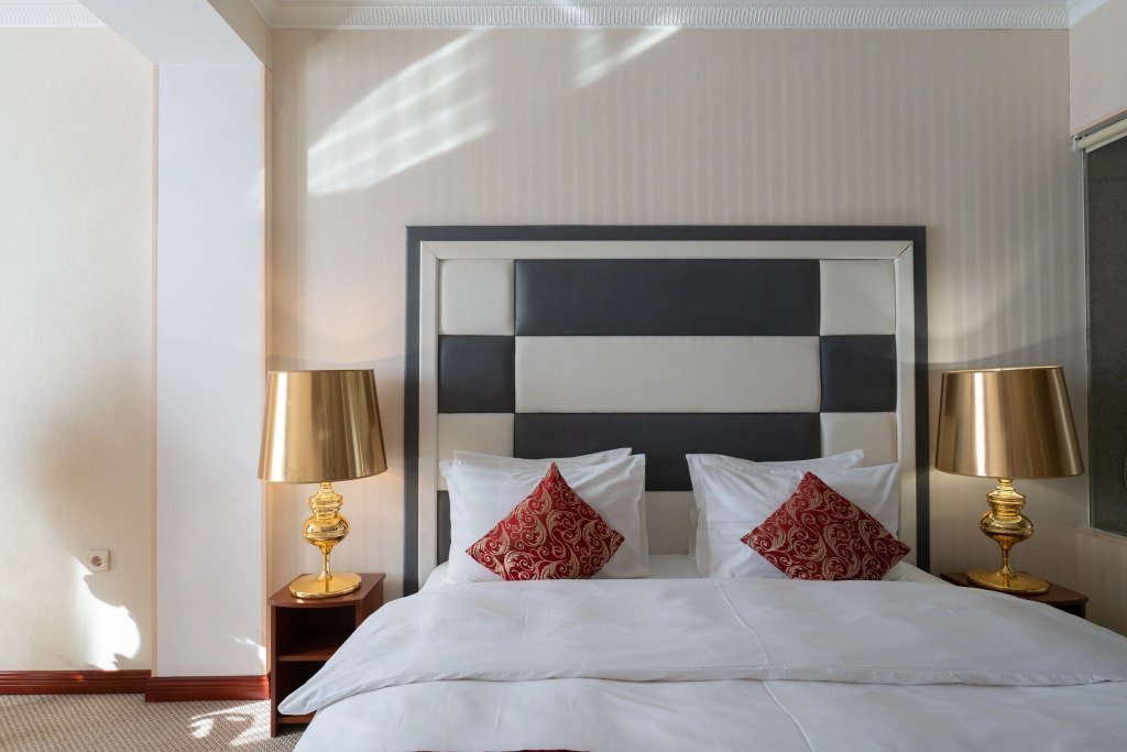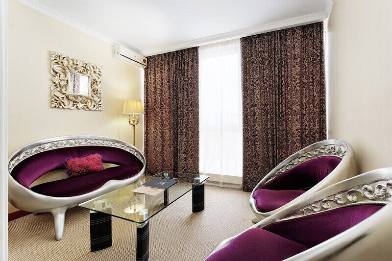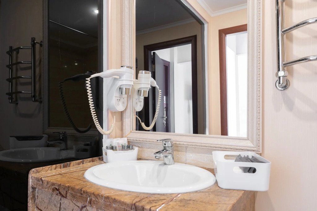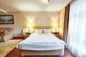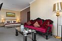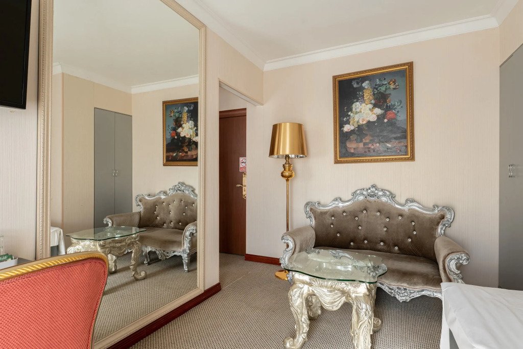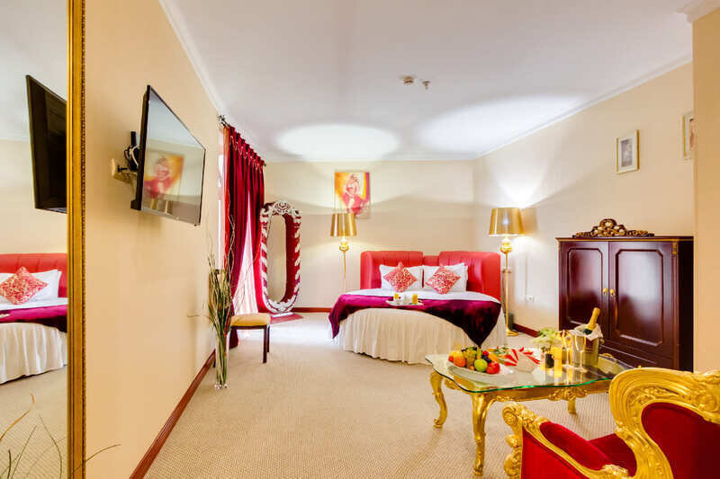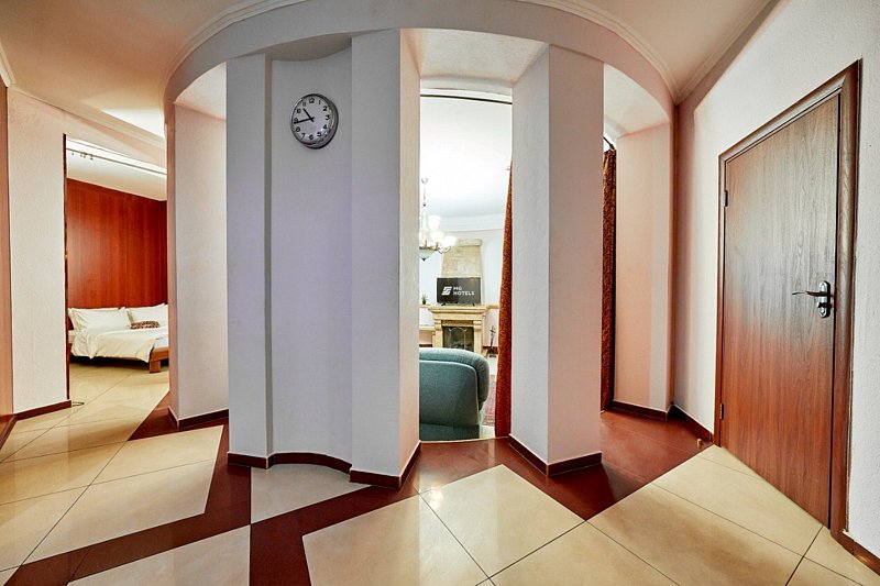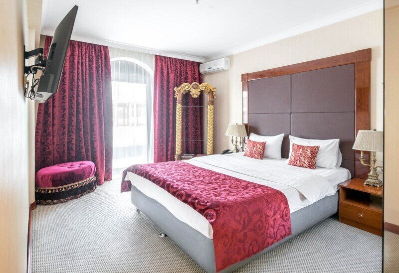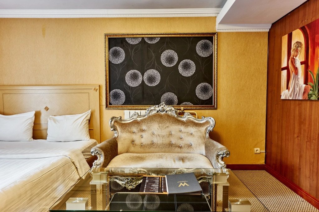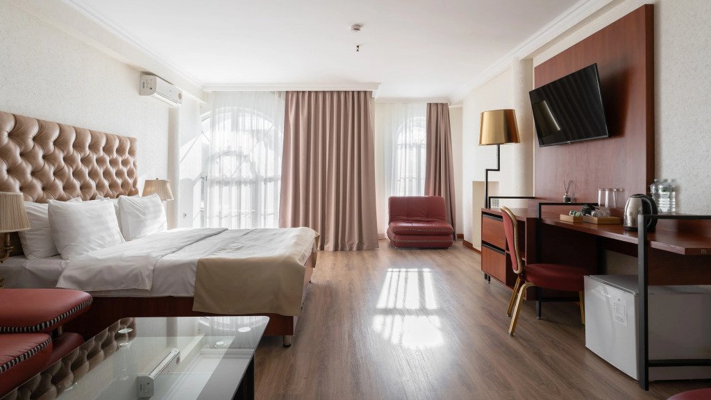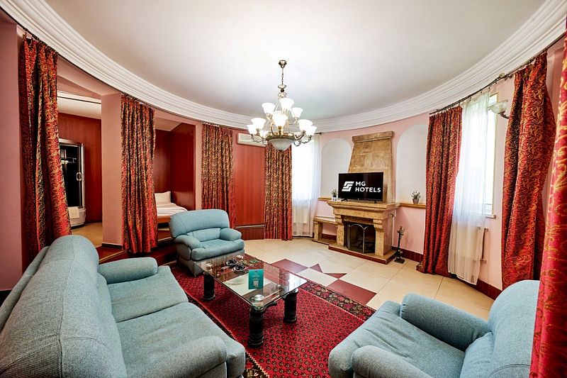 Шикарный номер категории «Люкс» – оптимальный выбор для солидного человека, влюбленной пары, молодоженов. Просторный и комфортный, с тщательно продуманным интерьером — здесь есть все, что может понадобиться вам во время отдыха. Интерьер выдержан в приятной теплой гамме, которая располагает к спокойному отдыху после насыщенного дня. Широкая двухместная кровать размера «King Size» снабжена ортопедическим матрасом, который гарантирует великолепный сон, а современная система климат-контроля обеспечит оптимальную температуру и максимальный уют в номере. В номере есть удобный письменный стол и высокоскоростной Wi-Fi, а также индивидуальный сейф для ценных вещей и документов. Номера укомплектованы мини-баром, чайной станцией, телефоном, феном, гладильными принадлежностями и халатами. Ежедневно при жилой уборке происходит пополнение гигиенических принадлежностей, питьевой воды. Мини-бар не входит в стоимость номера и оплачивается отдельно. Под запрос предоставляются косметический и бритвенный наборы. Окна номера выходят на тихую улицу, внутренний двор и на город, так что можете быть уверены: вашему отдыху не помешает шум.